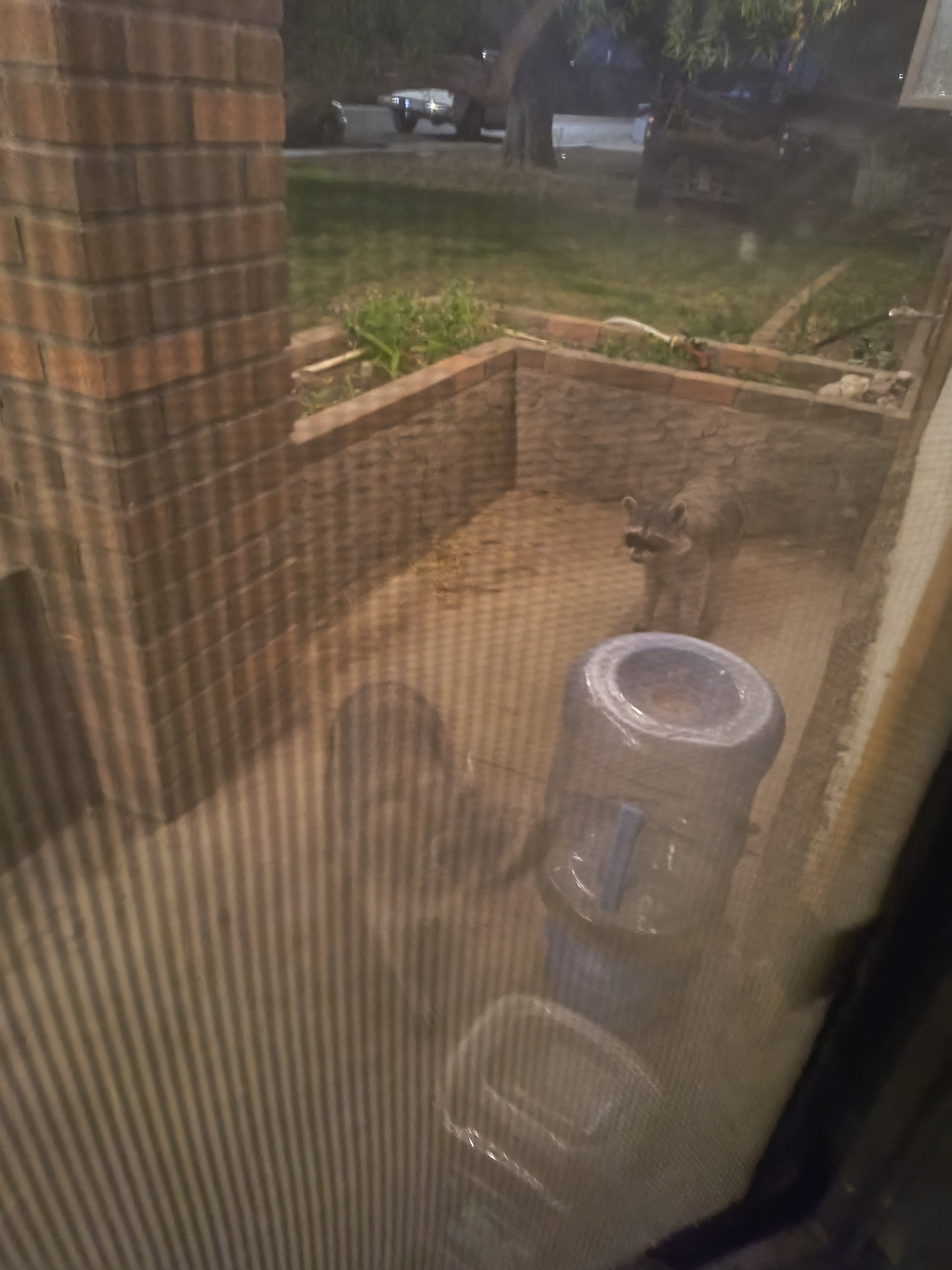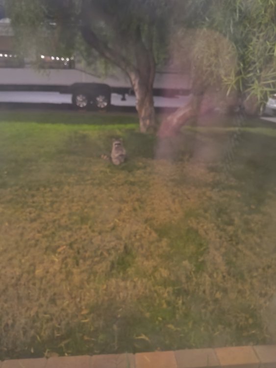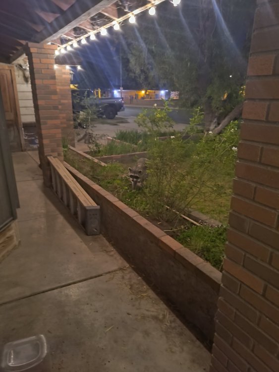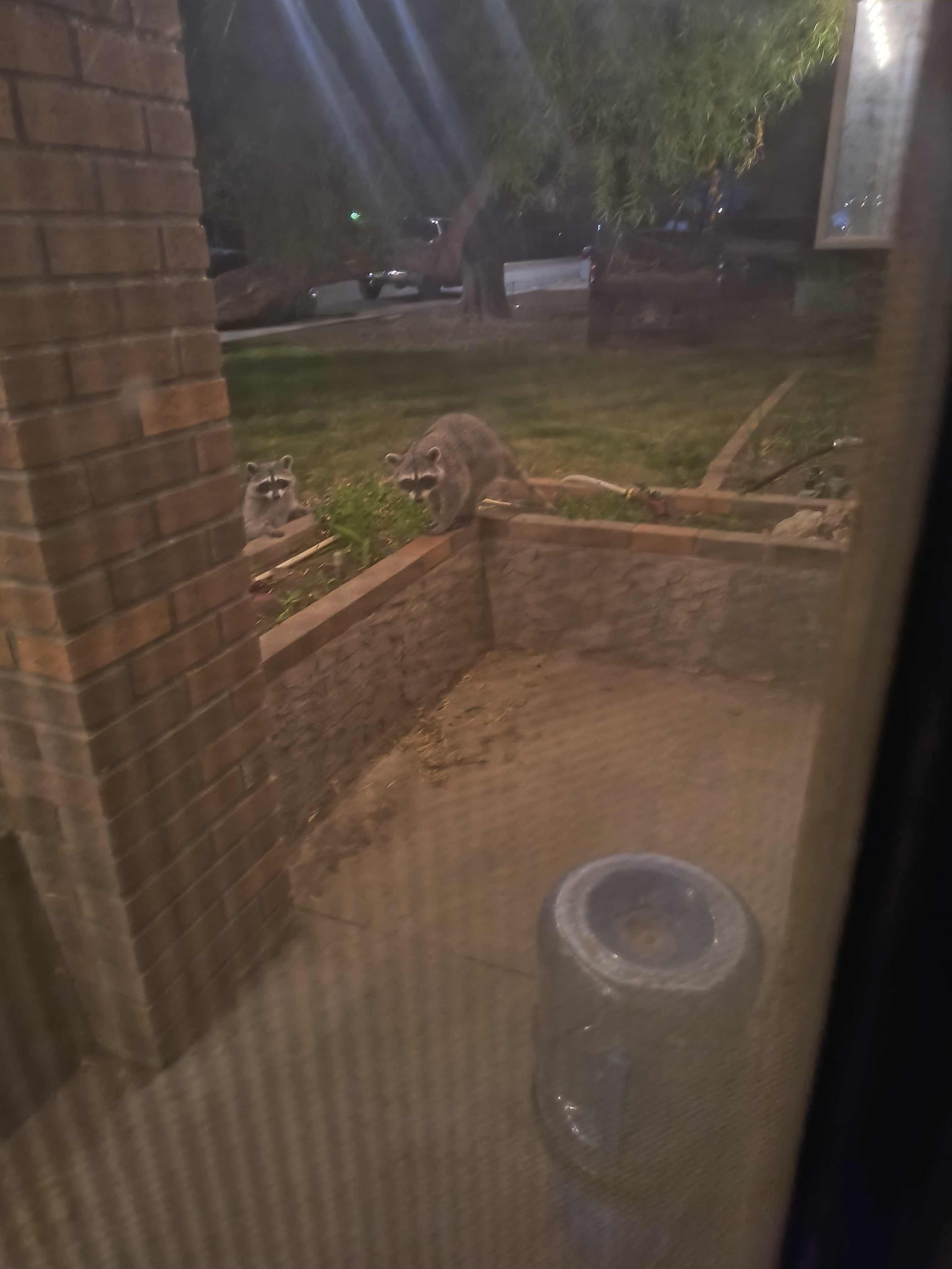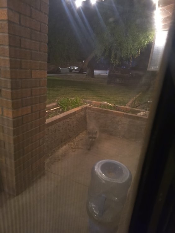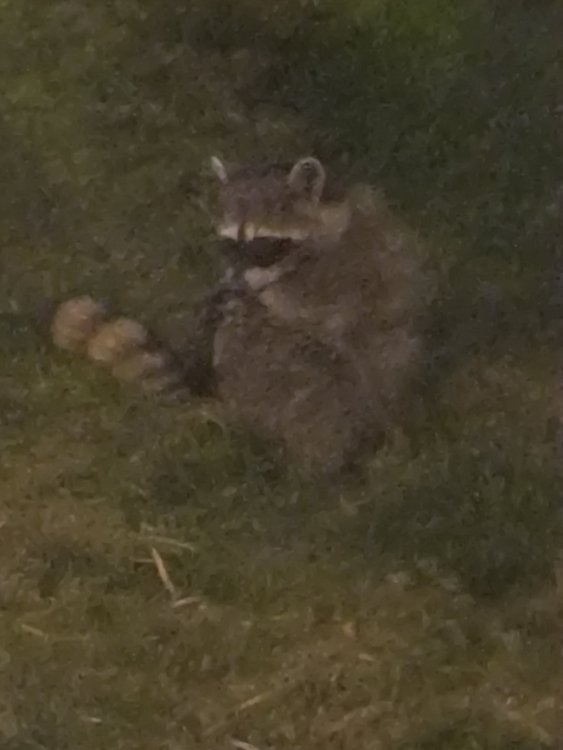 Here it is 2:30 AM. Looked outside and saw these two rascals. Mind you, in the city. Guess the outdoor cat feeder met with their dinning approval. Chas B