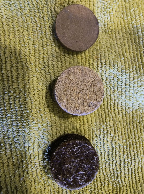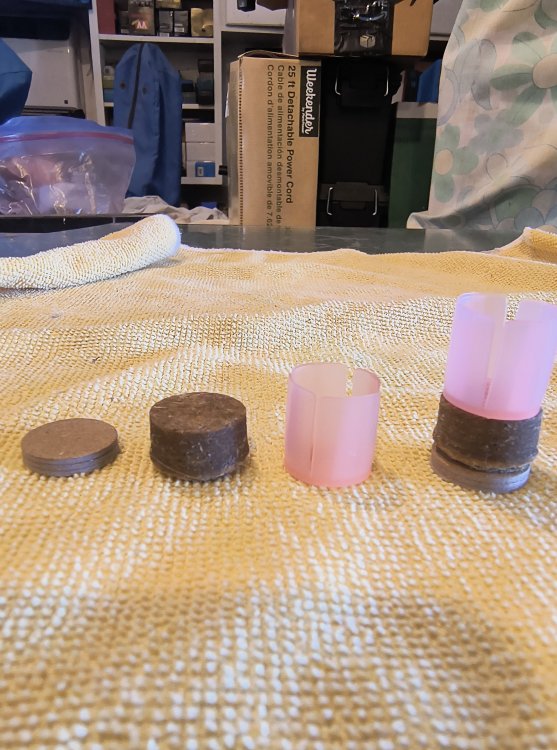 The following pics are of the nitro card wad, unlubed fiber wad, lubed fiber wad and shot cup. There are nominal dimension differences if rotated but there is no marked difference in diameter between the unlubed and lubed fiber wad. The nitro card wad is very dense which in my experience keeps any lube contamination of the powder charge. As Blackwater stated, I have shot rounds loaded several years prior to use and in one case four twenty five round boxes loaded eight years prior with no misfires. All have fired as if they had been loaded the day before. Chas B -