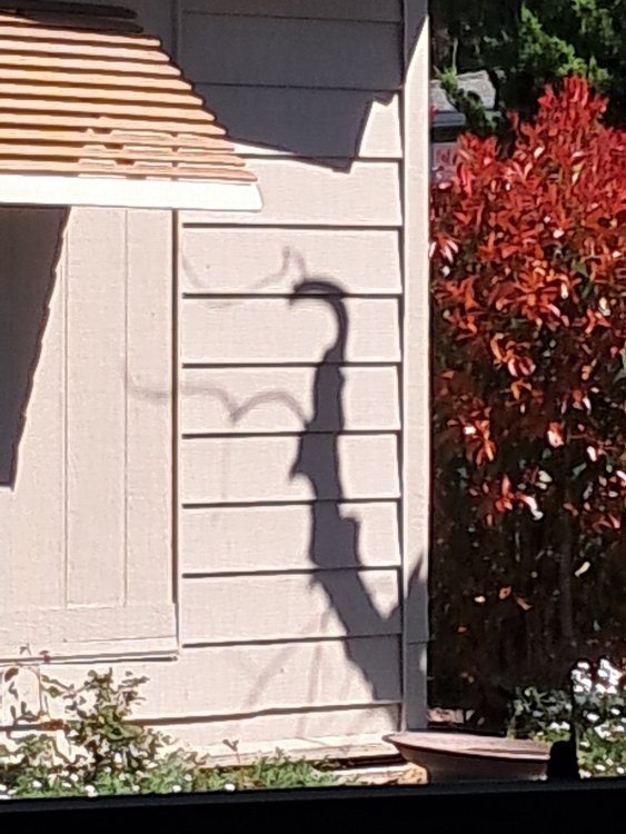 The grounds crew did a major cut back on a pepper tree about a week ago. More than they should have, really. But now we get an interesting shadow across the way.