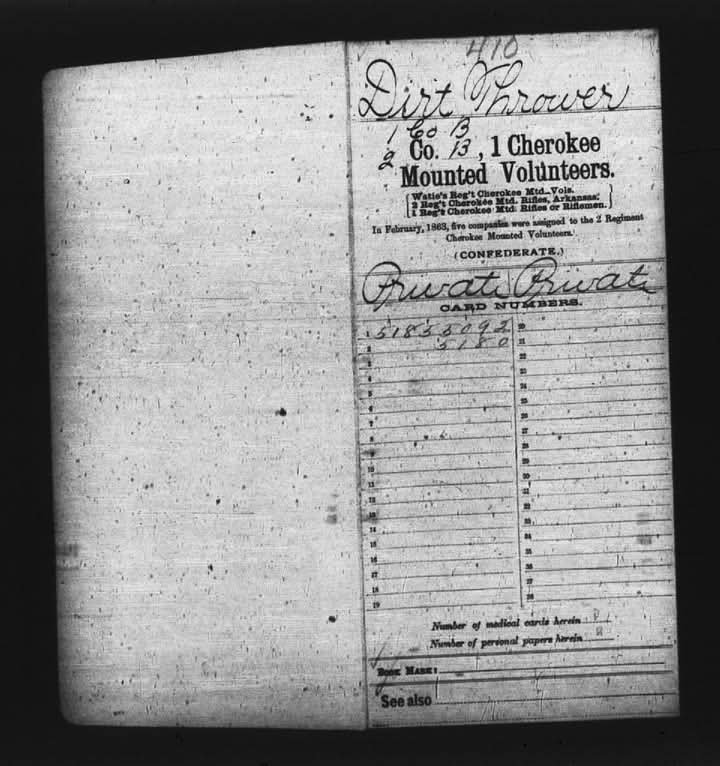 The photo is a page from Dirt Thrower’s Confederate service record. He served in Company B of Watie’s 1st Cherokee Mounted Volunteers.