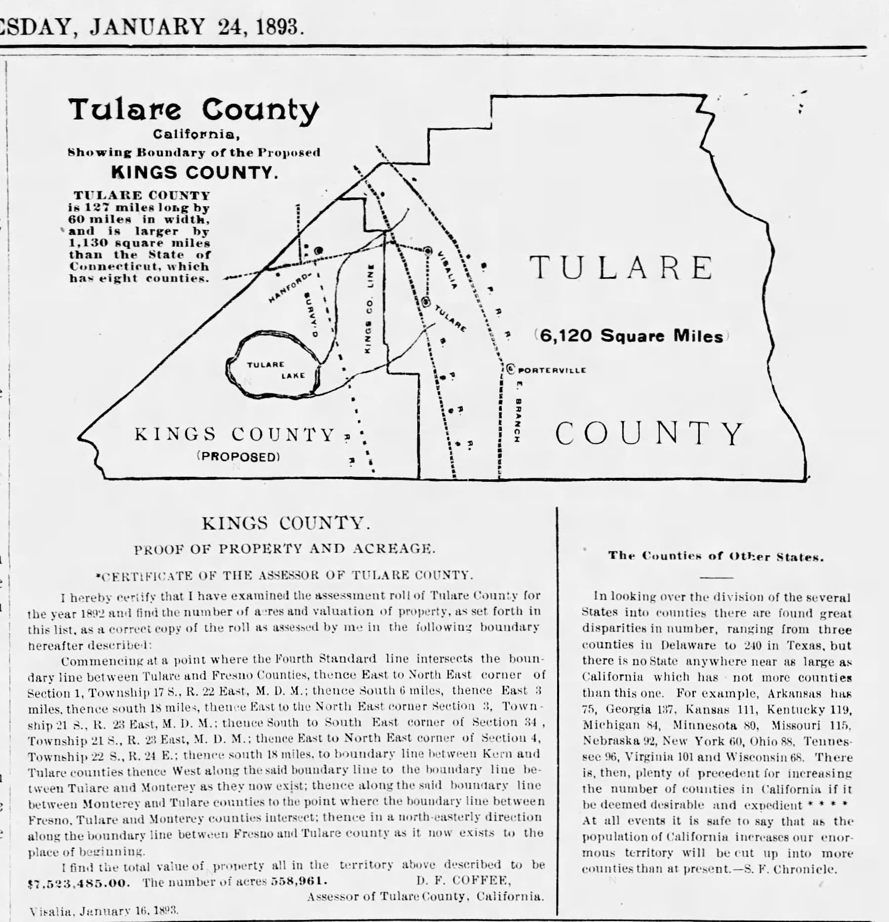 "The Formation of Kings County. Shown here is the proposed map of Kings County that was published in the Hanford Journal on January 24, 1893. At the time, there was considerable opposition against the formation of Kings County from Tulare County. Opponents even went so far as to propose other two other counties to be formed as well: Putnam County, which would have Porterville as the county seat and Buena Vista County, which would have the City of Tulare as the county seat.