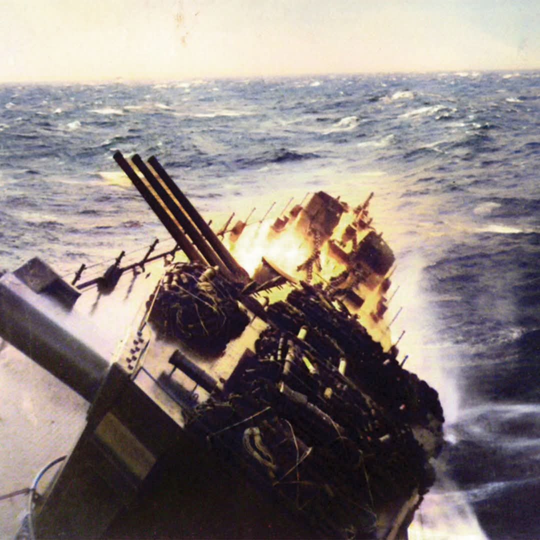 This dramatic moment captures the moment the United States Navy light cruiser USS Santa Fe (CL-60) experienced a severe roll of approximately 53 degrees while encountering giant waves in the South China Sea during Typhoon Cobra in December 1944. This near-fatal angle of roll demonstrates the ferocity of nature's wrath on a fleet operating in the Western Pacific.