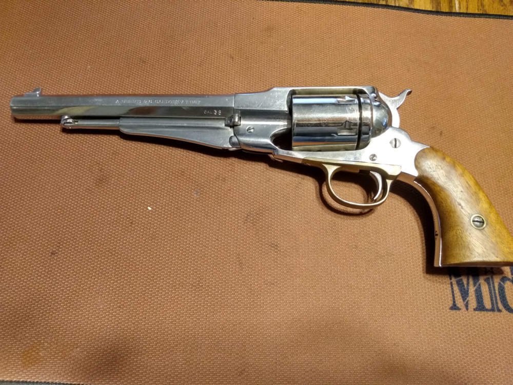 Made this one myself. Made the new cylinder and backing plate, put a firing pin in the hammer, sleeved the barrel with a Dan Wesson barrel. The gun is a Ubertie, but was originally a .44 cal adjustable sight model. I had a welder at work fill in the area where the rear sight was, the front sight is dovetailed in. and cut deep enough to also hold the barrel so it can't move . The grip frame is different than a Colt, when I was shooting Duelist I found it hard to reach the hammer with my thumb. Shooting two handed is no problem. I think I have about 100 hours in this gun. Side note I once shot it at Tusco before I sleeved the barrel. I hit 4 targets every station, didn't do as well with my Colt. The guys were teasing me that my 38/44 was already more accurate than my Colt so I didn't need to sleeve it. -