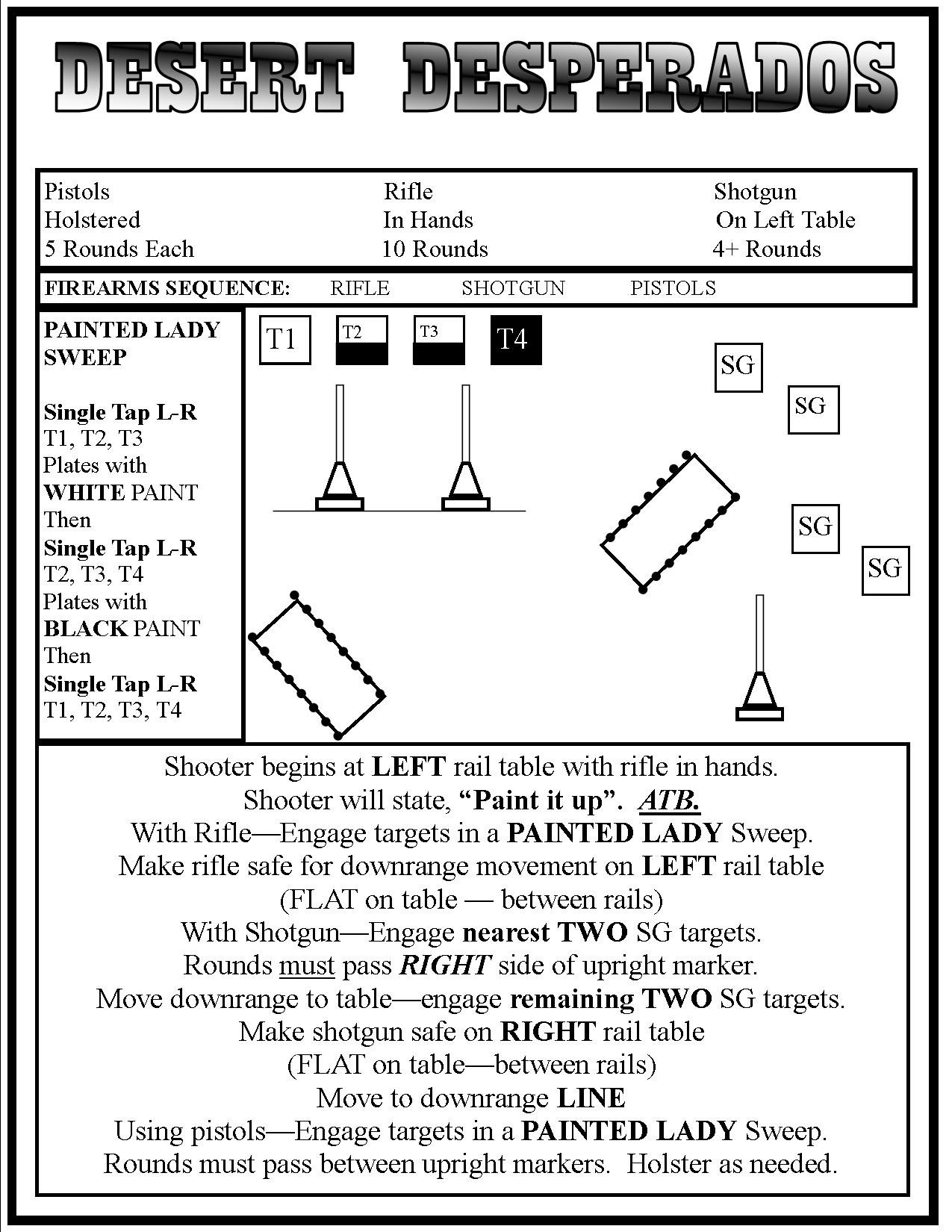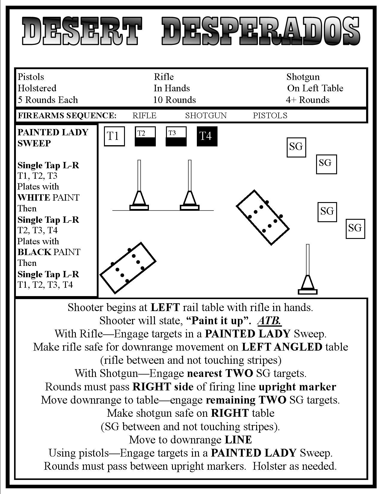 First - Let me say how much I love seeing these questions being asked. Writing stages, whether its regarding staging, sequences, movements etc. that eliminate or at least minimize ambiguity, and inconsistent calls should be the goal of EVERY stage writer/ match director. For downrange movement on a flat surface - I have always been a fan of the "Angled table" or the "Railed" table. An angled table is simply a "normal" table set at a 45 -70 degree angle from the firing line. Using tape; you mark the table into 2' foot sections. Firearms must be RESTAGED (safe for downrange movement/ aimed into the side berm) within these 2' sections with no part of the firearm touching the tape. The other method is your "normal" table set LENGTHWISE to the firing line at a 45 - 70 degree angle. This table has "Rails" (any simple lightweight trim/ board that extends above the table) attached to the lengthwise edges and the firearm must be placed flat upon the table between rails. I have attached an example of using both styles in stage form (same stage - different tables). -