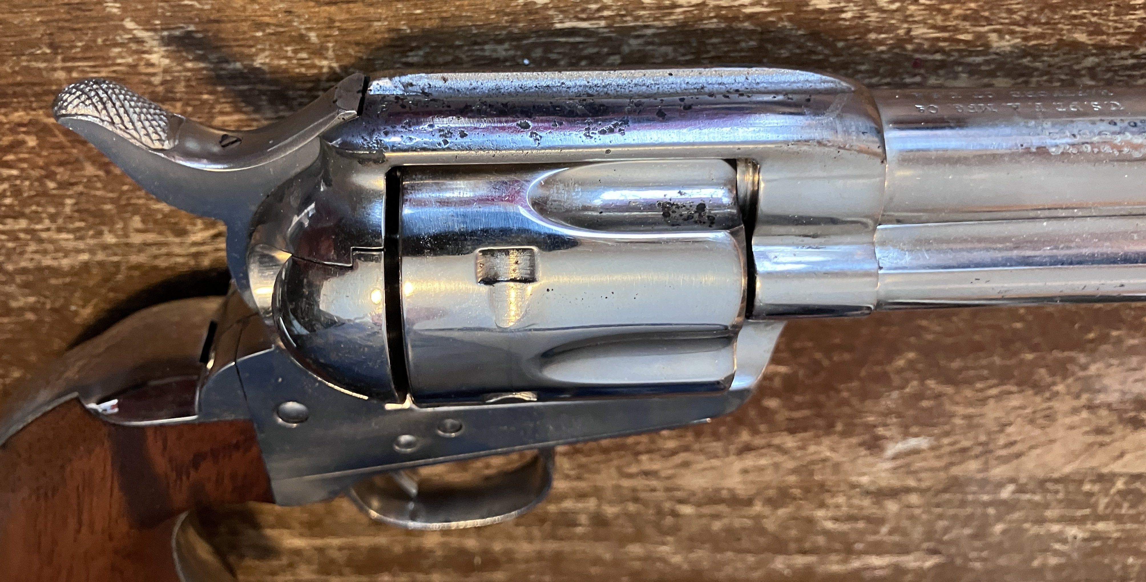 As you can see the nickel finish is pitted and flaking off. Now, this gun is a USPFA revolver. I know it's a glorified Uberti, but it IS a part of the USFA story. Again, I'd have to find someone who can do nickel, or consider changing it blued. If I decide to go forward, that'll be the choice I have to make.