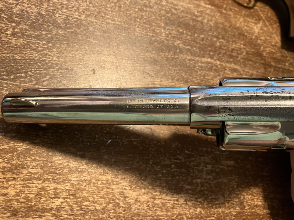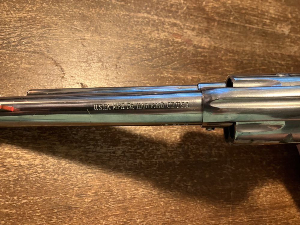 I guess this is as good a time as any to mention that the box my pistol came in is not the original. For one thing the box clearly says the pistol inside is a 7-1/2" barrel. Mine is 5-1/2. But all of this has led me to be more curious about the specifics of my pistol. Oh how I wish USFA, if it had to die, had sent its records to Cody, or SOMEONE who could use them to share information with us. Alas, it seems it is not to be.