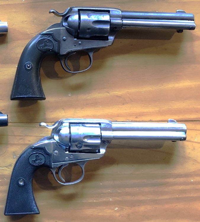 Very nice. Of course, this brings up the question; how exact does a pair of pistols have to be to be a matched pair? I mean, sure, one Colt with a 4-3/4" barrel and another with a 7.5" barrel is not a matched pair. But... Actually, it will be better to ask this question with pics. Now, in the initial post, we see 2 7.5" Colts in .45. I would say these are a matched pair, even though the grips are not the same. But, are these a matched pair? Both are Colts. Both are .32-20 with the same length of barrel, but have different finishes. Are these a matched pair? They have different front sights. I would say yes. I know people who would say no cuz they are not exact. Would a Uberti Schofield in .45 Colt and a 3rd Model S&W Schofield in .45 S&W be a matched pair? What about a Colt and a Clone with the same finish and barrel length and caliber? It is a puzzlement.
