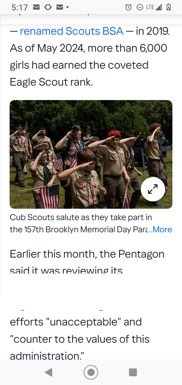 I saw a news article this morning about how the United States military was discontinuing it's alliance with what used to be the Boy Scouts of America. It had a picture that was captioned CUB SCOUTS SALUTE... The kid in the center front look like he could be a Cub Scout, maybe. And he did appear to be saluting with two fingers. The girl behind him also looked to be of the age to be a Cub Scout, but her hand was so closed up I couldn't tell if she had one finger curled or two. The other dozen or so people scattered around them looked awful big for Cub Scouts. They were wearing green trousers - which, back when I was a Boy Scout, was for Explorers - and they were wearing khaki shirts. No blue. Again, back when I was a Boy Scout, Boy Scouts were khaki and Cub Scouts wore blue. One kid in the picture was wearing that stupid red beret. Is that still part of the uniform? I thought / hoped they had gotten rid of that years ago. One of the "Cub Scouts" in the picture had a beard so I'm assuming that he was a scout leader.
