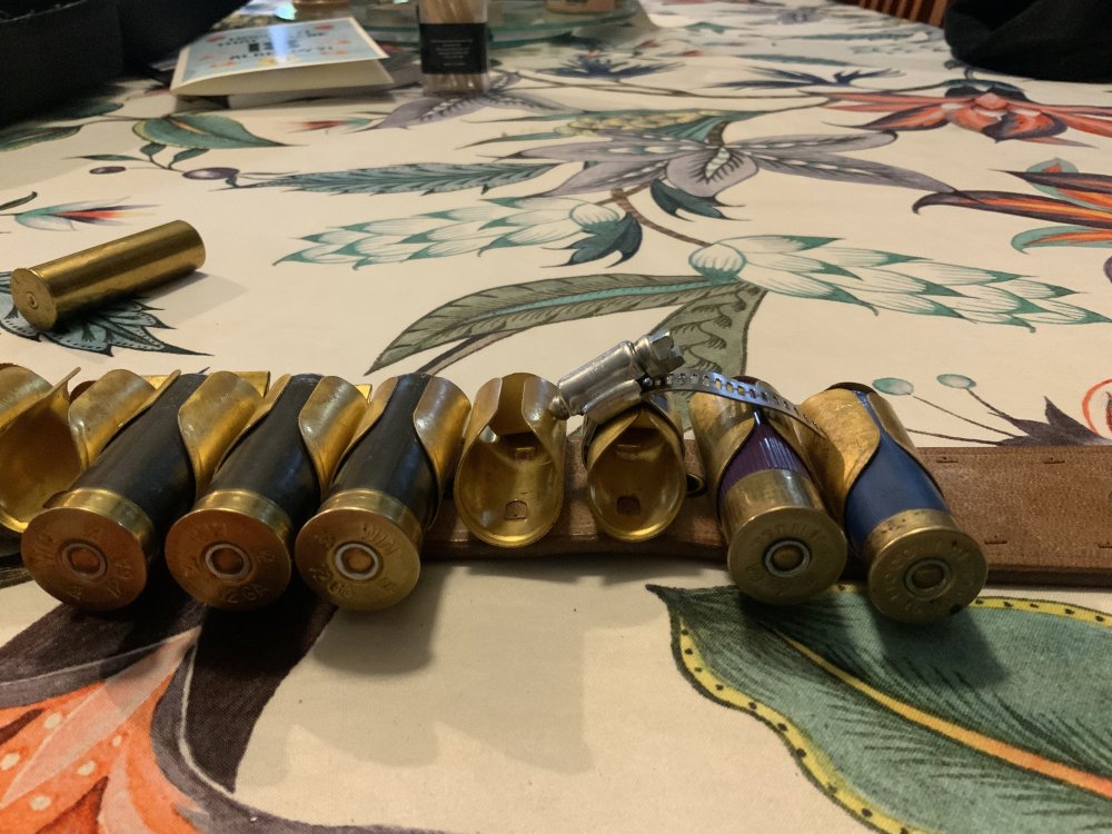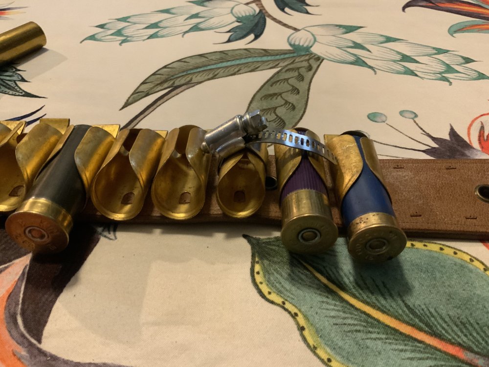 Well my jig is really simple, it’s a hose clamp. Works pretty slick but time consuming. The 2 16 gauge shells to the right of the hose clamp are in the thimbles that I resized. The 3 12 gauge shells are to the left are in original sized thimbles. It’s a rainy day so that’s what I’m doing today.