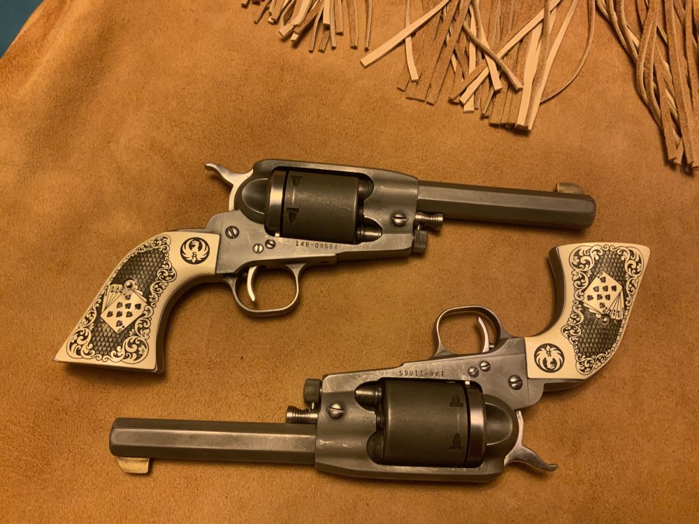 Here is a pair of Ruger Old Armies that he installed octagon barrels on and then bead blasted. He installed the brass front sight also. -