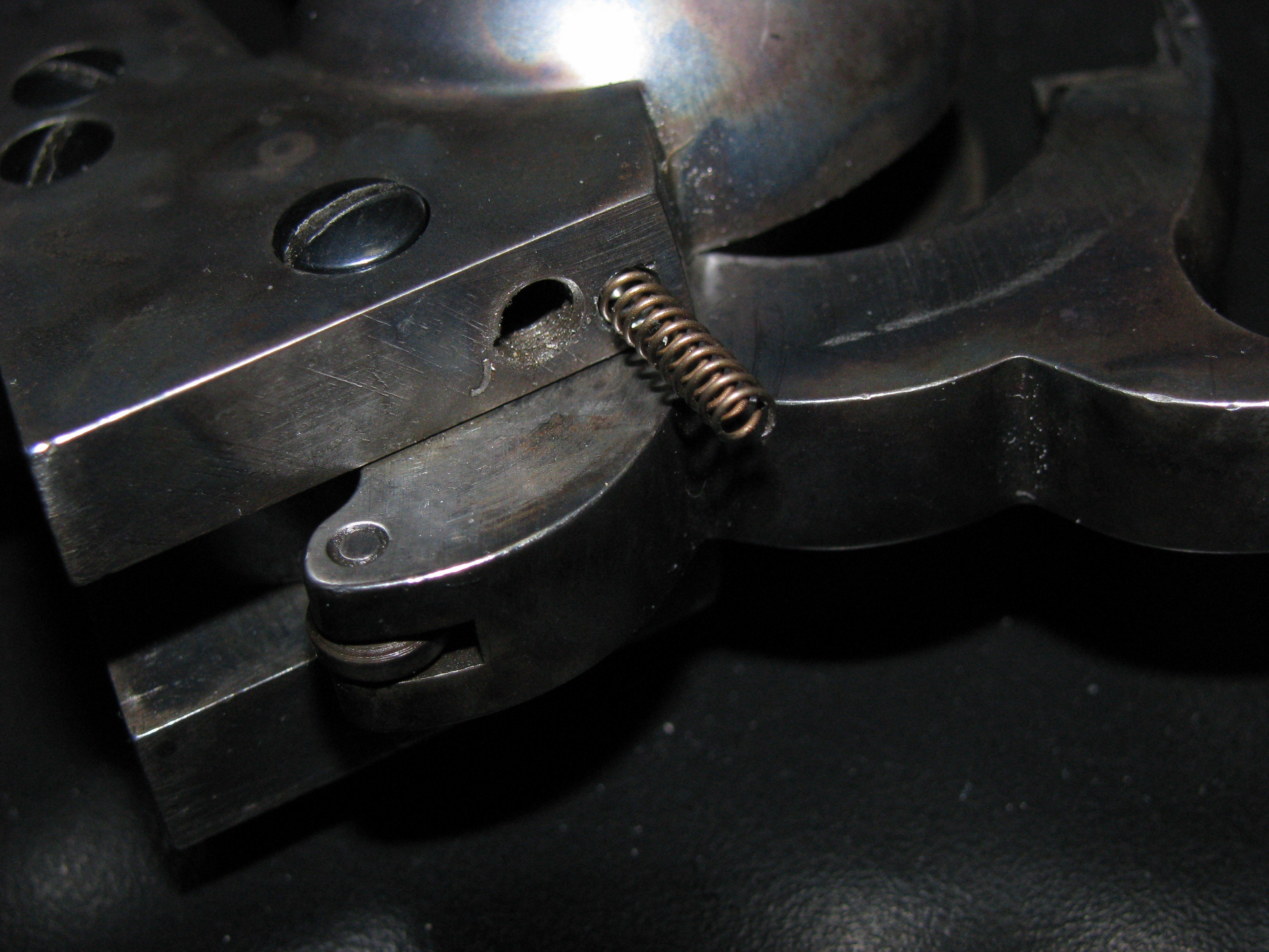 I've had all my Colts modified to a Ruger plunger and coil spring for the hand. remove the Colt flat spring from the hand and polish, a proper sized hole just above the left backstrap screw (looking at the back of the gun) for the plunger & spring. Kiss broken hand springs goodbye! Here's what you'll have as done on my 2nd Gen 1851. here it is in place on a 3rd Gen Colt SAA. This SAA had the modification done 36 years ago, no broken hand spring since. The 1st 1851 was done in 1987, again, never broke a hand spring in it.