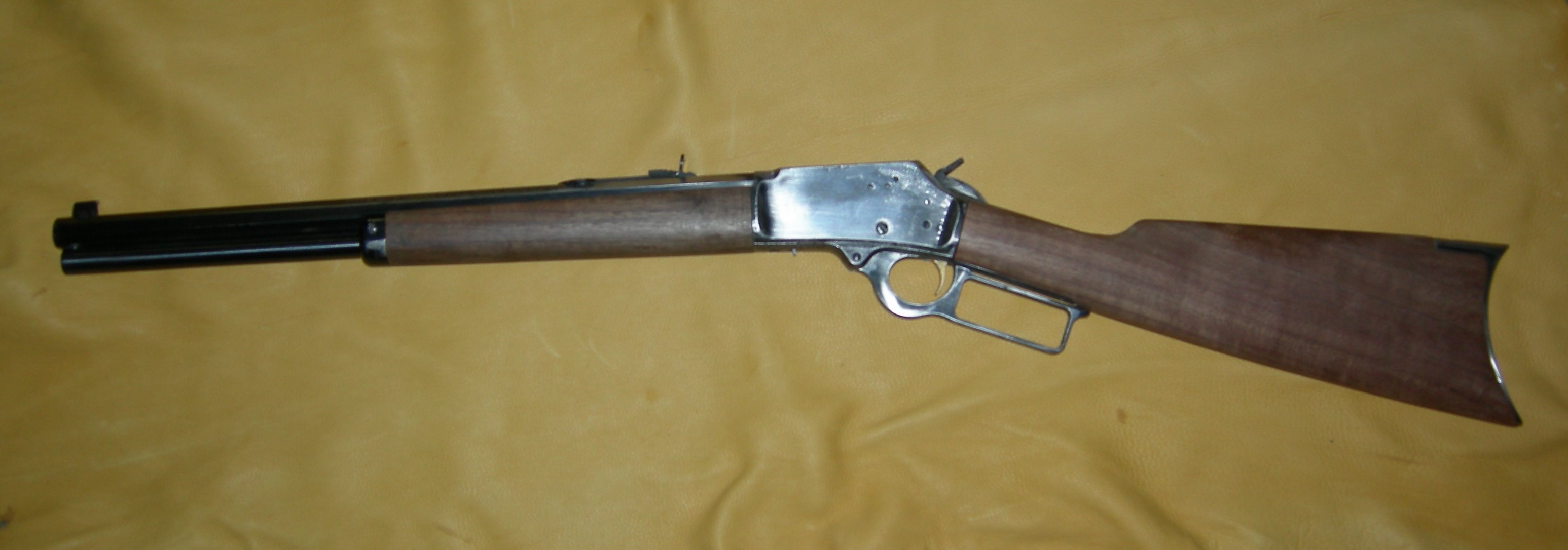 I'm not a collector, and have very few old guns. A .32 Short "Lemon Squeezer that's never worked, a .38 S&W top break that's aged to a nice plum, it works, pretty well, but could use a little "tightening up"... I have a Marlin 1894 that I bought as a "kit gun". Frankly, externally it was a rusted hulk of a carbine in 44 Mag, yet nearly pristine internally. Someone had attempted to rebuild it with a 45 Colt Cowboy bbl., but became discouraged. So for $350 I became its new caretaker. Since, it was uglier than sin, whatever I do to it will be an improvement, even if only in my eyes. I've turned it into a "short rifle", and modified the carrier to feed the C45S. While I haven't achieved it yet... I want it to feed 45 Colt also. And until then, the metal will remain unfinished. Plan is to CCH the receiver, lever, buttplate, nose-cap, hammer, and lower tang. Pictured here with about 3 coats of tru-oil on furniture. I've heard some folks express the feeling... "we're only the caretaker of a firearm while it's in our possession... we should pass it on unmolested..." For a historically important firearm, I'd agree... but who determines whether any particular firearm is "historically important"? My feeling is that the person in possession of it does. So... if Colt SAA serial #1 was in my safe, I'd think that'd be a pretty historically important firearm... (and probably sell it)... but serial #SA61xxx, not so much... other'n it's mine! I'm not a believer in defarbing a firearm... or prematurely aging a piece... while one's intentions may be pure... later caretakers may decide to take it that one step further and unload it on an unsuspecting newb, as something it ain't. I'll not enable their deceit. Although... the diatribe on that Marlin Cowboy bbl is mighty tempting to remove! I have softened it up a bit... -