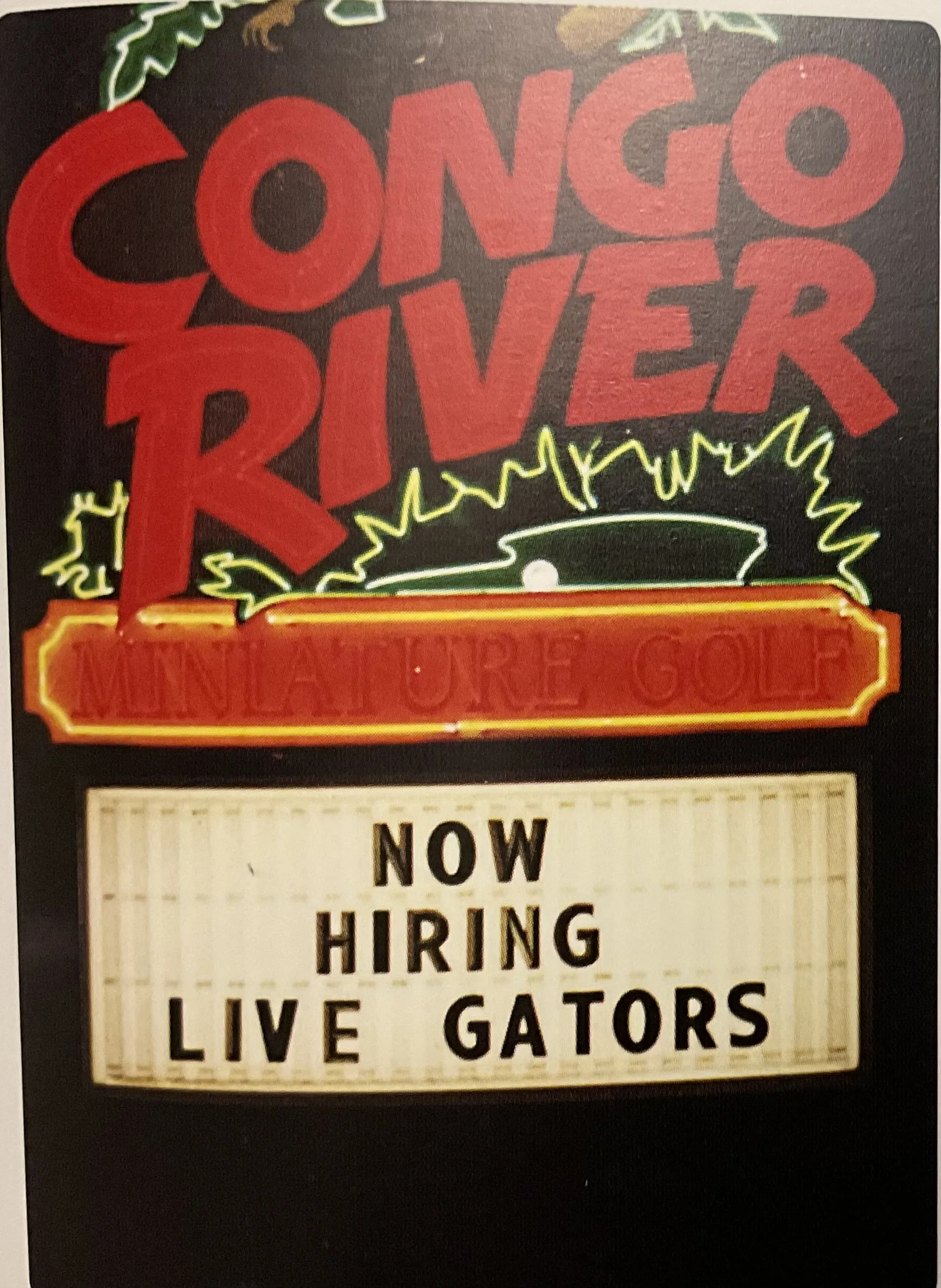 That place in in Clearwater, Florida. It has/had a wrecked airplane next to that sign. I don't know why they want to hire more gators though.