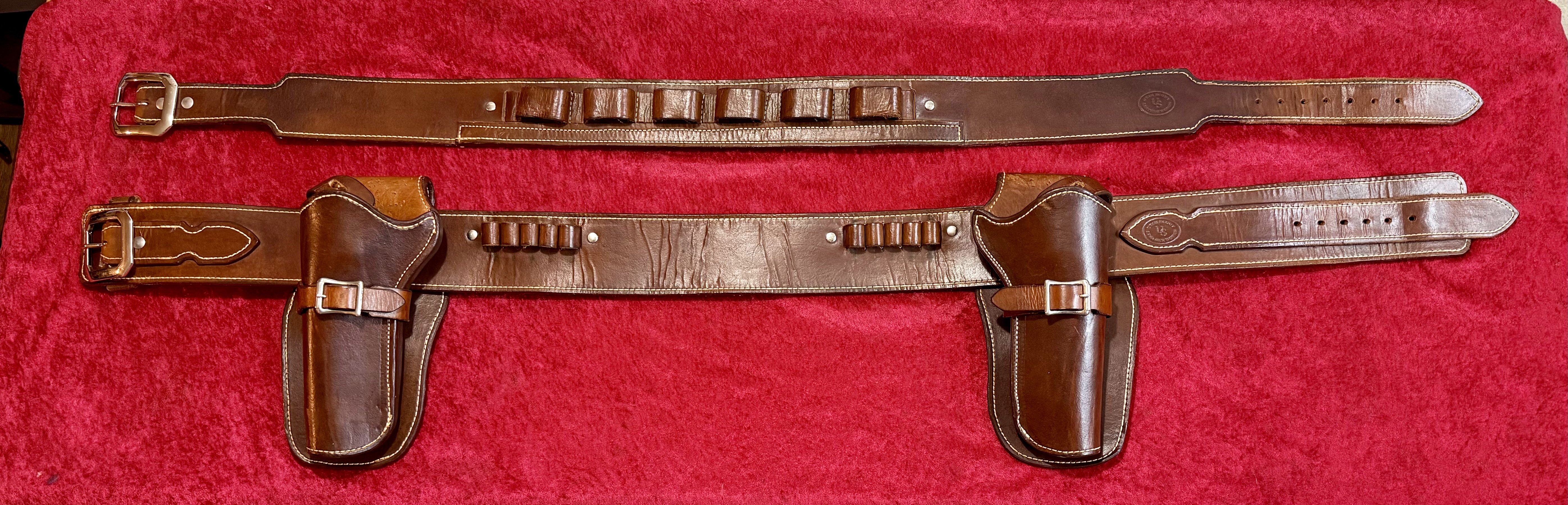 SOLD A complete Utah Scout leather rig. Cartridge belt 41”-42” to center holes, rough inside so it won’t slip. Two straight hang holsters, they fit Vaqueros, New Vaqueros, Colt SAA, and Italian clones as well. Also included is a matching shotgun belt, 41-42” to center holes, rough inside so it won’t slip, with 6 12ga double loops. The loops are 44/45 caliber. $275 plus $22 priority mail shipping.