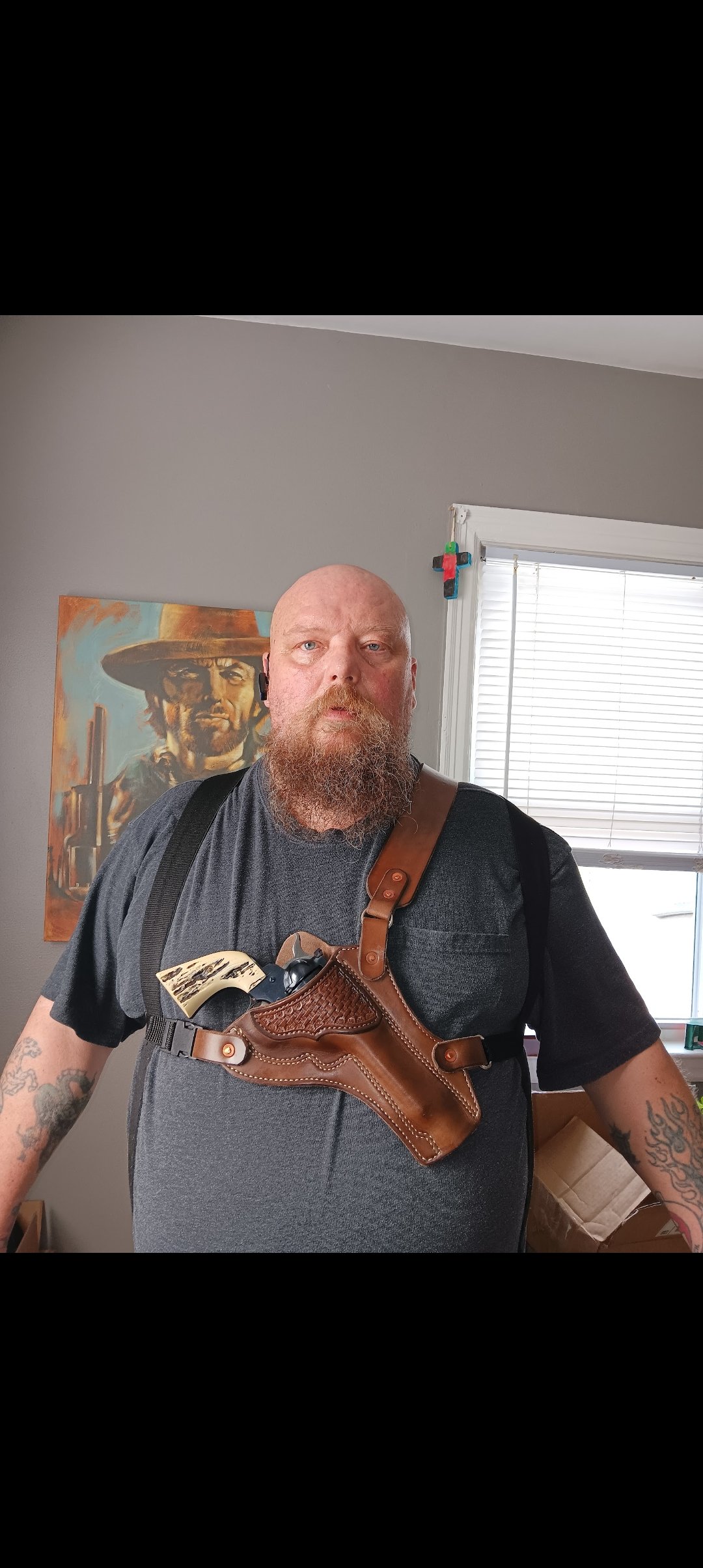 This is a chest rig made for me by my Brother in Arms ( Ruby Burrows ) Its made for my Ruger Blackhawk 44 Special FlatTop 4.5/8 I load it with Elmer Keith's favorite 44 Special recipe. This is My Pig Hunting Loadout !