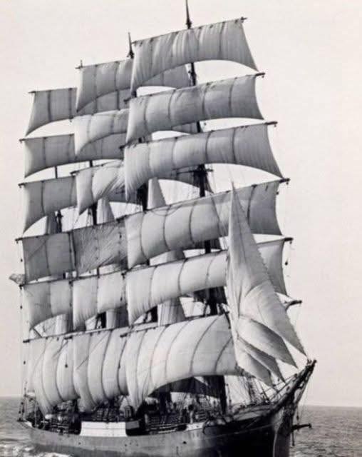‘PAMIR’ - Commercial Sailing Ship Master Mariners of Australia. Pamir was one of the last commercial sailing ships to transport cargo around Cape Horn. The Pamir, a famous German four-masted steel barque (1905–1957), was a renowned "Flying P-Liner" in the Australian grain trade. She had an overall length of 114.5 m (375 ft), a beam of about 14 m (46 ft) and a draught of 7.25 m (23.5 ft). Three masts stood 51.2 m (168 ft) above deck and the main yard was 28 m (92 ft) wide. She carried 3,800 m² (40,900 ft²) of sails and could reach a top speed of 16 knots (30 km/h). However, her regular cruise speed was around 8-9 knots. While mainly operating out of South Australia, the vessel is associated with Australian maritime history, including visits to Sydney and, via historical records/photo collections, Newcastle during the first half of the 20th century. Pamir, built in 1905, was famous for transporting goods such as wool and grain between Europe and South America. It was part of the German fleet known as the Flying P-Liners. On 21 September 1957, she was caught in Hurricane Carrie and sank off the Azores. A nine-day search for survivors was organized by the United States Coast Guard Cutter Absecon, but only four crewmen and two cadets were rescued alive, from two of the lifeboats. It was reported that many of the 86 men aboard had managed to reach the boats, but most died in the next three days. The sinking made headlines around the world; it was a national tragedy for Germany.