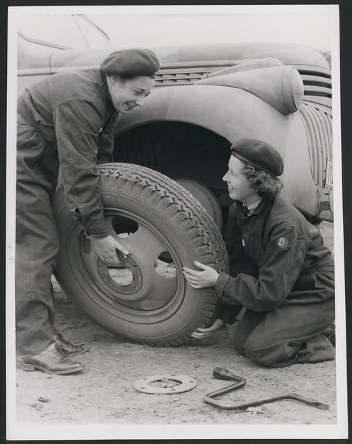 The image shows two members of the Women's Auxiliary Australian Air Force (WAAAF) changing a tire on a vehicle during the Second World War. The WAAAF was the first women's service to be formed in Australia, created in March 1941 to release male personnel for operational duties overseas.