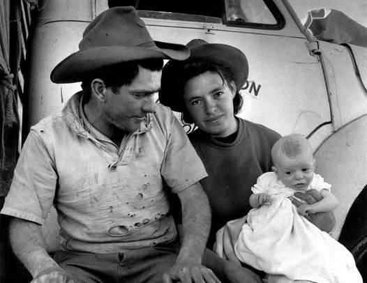 THE DROVERS WIFE 1958: The drover's wife is Mavis Kerr, then a 16½-year-old seated next to husband Ron in ragged shirt and holding baby Johnny, who was three weeks old when this photo was taken. They met at a sheep station when Mavis, then 15, accompanied her father, who was having a break from droving to take on the mail round. For the last 53 years, her hauntingly beautiful eyes have stared out from a distant, sepia world. There is something in those eyes that compels you to stare back. With a battered Akubra on her head, she sits resting against her husband in his tattered shirt, nursing their three-week-old son. A sense of serenity permeates the scene. This photo, one of the most acclaimed images of life in rural Australia, was taken by the late photographer and author Jeff Carter in June 1958. The couple were Ron and Mavis Kerr, and their little bub was named Johnny. Jeff Carter had found them at Urisino Bore in western NSW, while they were droving a mob of 3700 merino ewes between Tibooburra and Coonamble. There they sat in the shade of their old Bedford truck, “just having a spell”. What happened to the Kerr family? Did this young mum stay the drover’s wife? Or did she seek an easier life and move to the big smoke? Hardly. Mavis and Ron live in remote Borroloola in the Northern Territory – a small town of around 700 about 950km south-east of Darwin. Johnny was the first of five children, three boys and two girls. The droving finished in 1963, when Mavis had the last baby. Ron became a head stockman and the children were educated through correspondence courses and at boarding school in Alice Springs. “I’m still the drover’s wife,” Mavis laughs. Today, as Mavis and Ron arrive in Darwin to relive their experiences, they are instantly recognisable. They look at their old truck, which resides in the hangar at Darwin airport, and are transported back to the dusty stock routes that were their way of life.