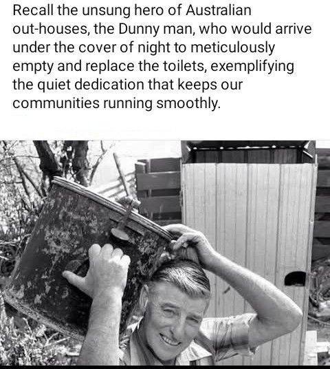 We're on septic now, but before that we were on a long drop and a new one would be dug when necessary. Here's a read for you (nothing to do with me or my family) - Of Dalliances and The Dunny Men. Not having sewerage connected was normal in Australia during the time of European immigration from early days till the 1960’s. The enormous distances between houses and suburbs and the sheer spread of just a few hundred people over many kilometres of land made the provision of infrastructure such as a sewerage system too expensive for many suburban areas at that time. The way out was for the local Council to provide a ‘dunny pan’. This pan was a heavy metal container coated with pitch or bitumen and actually smelt quite fresh and spicy when just delivered. A bit like an industrial harbour foreshore, with moorings and thick ropes, tarred anchors and pylons. This pan would be used in a small outside room of about a couple of square metres and called the ‘dunnee’. An outside toilet, sometimes politely called by the upper shore, ‘the outhouse’. You have to go sometimes, don’t you? The dunny pan would be covered by another outer metal shell with a hinged wooden lid. With some imagination this could then be seen as a toilet. However, when lifting the lid, no matter what it looked like from outside, the smell and darkness from inside was broodingly brutal and left nothing to imagination. Not many would linger reading poetry or Thomas Hardy. The pan would be collected once a week by burley blokes in blue singlets and verdant armpits, who would come before dawn and summer heat, to heave the sloshing but lidded pan on shoulders and put on the truck with the driver having a Lucky ciggie. Coarse oaths would be renting the still morning air and heavily shod feet would crunch the concrete path along the side of the veranda. This dunnee pan would be capped by a lid secured on top with a metal band that would lever the lid tightly around the container, not unlike some preservatives such as sour Kraut or apple sauce of the present day. This was a job purely reserved for the dinky-di locals and much coveted. It was well paid and had all sorts of lurks, including dalliances with lonely women and early ‘knock-off’ times when finished. I am not sure if the smell added to their appeal, but rumours had it that many a woman, widowed, single or even married, was left happy after an early visit from the ‘dunnee man’. Large families were given a ‘special 2 pan treat’, this usually meant giving very generously at Christmas time.( A couple of crates of beer would suffice.) Any large family that were too stingy at Christmas would soon find a lonely single pan again. Those dunnee men were often kind rogues but a law onto their own, revered and respected by many, but feared by some. The ‘dunny man’ is now part of folklore and Tamworth Country music, but long gone since. Our family was more than large and dad had to make some adjustments to a down pipe outside the dunnee that would carry rain water from the roof to the open storm water drain at the front of the street. Despite our generosity towards the Shire’s dunnee men at Christmas time, we never had more than two pans a week. For our family this was not enough. I never did find out how our neighbours coped, they had six children as well. We were on friendly terms but not that friendly that you could ask; what do you do with your poo? In any case, their concern was more focussed on the fan tail pigeons’ shit on their shiny new roof tiles, all caused by my brother John’s flock of sixty birds… It would be unwise to mention anything to do with poo! It was not as if our family were too copious with ‘solid stuff’, no, it was the sloshing around of the liquid waste that was the problem. Of course, being right next to neighbours it wasn’t as if one could go outside at any time and urinate in the garden. This is what happened though. When the height in second pan became critical, and the dunnee man still a day or so away from collecting, that the boys were told to do as much as possible at school or wait till late at night and then in the garden in the dark. In the summer this caused some olfactory concerns and when this ammonia like stench could no longer be hidden or blamed on Dad’s fertiliser for the veggie patch, that Dad did a piece of engineering that is still admired until this day, alas without his presence. As I already said before, there was a metal downpipe running on the outside of the dunny that carried rainwater from the roof to the trench at the front of the house. Dad simply cut a small hole in the fibro on the inside of the dunnee directly abutting the downpipe and conveniently next to the pan. This hole was also made on the inside of the downpipe, accessible now from within. Both holes corresponded and synchronized brilliantly. This hole was then used by all the males (six in total) as a urinal taking the piss straight down the downpipe and to the front of the house in the open stormwater trench. This trench was usually overgrown with weeds. Generous rains would wash it downhill and finally into concrete stormwater and into the Georges River. Council used to come along three times a year to get rid of the weeds and mow the grass around it. Well, our trench was the most luxurious green and lush looking of the whole street. It would have won a blue ribbon for excellence if that nature strip could have been entered into the Royal Easter Show. It wasn’t till some years later that sewerage was connected and my mother’s dream of ‘own bathroom’ with inside flushing toilet was truly fulfilled. My father was a genius. With the toilet indoors, the dunny man receding into history; we were all riding high in the achievements wrought so hard by this migrant family of six children and parents.
