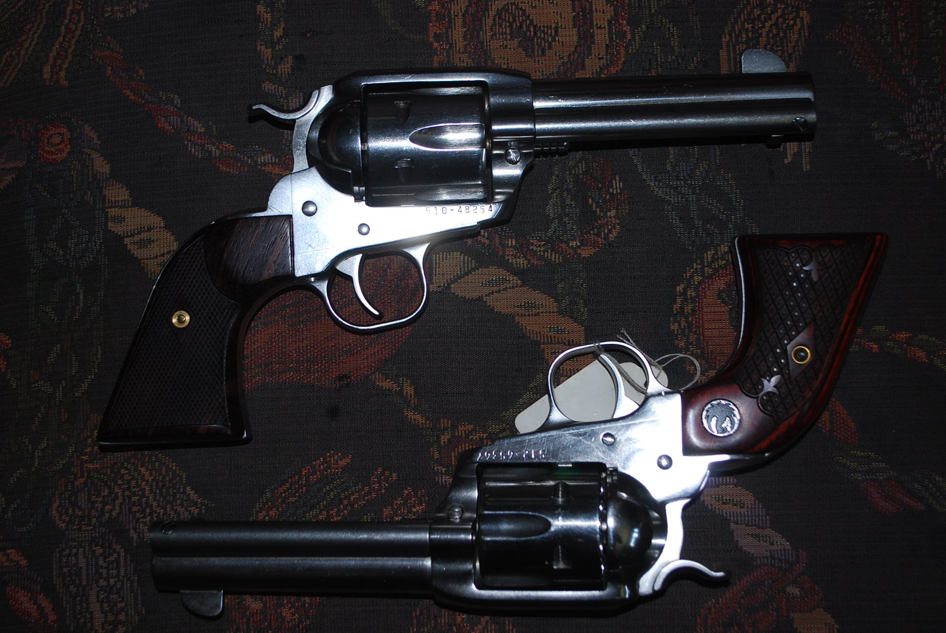 I purchased each of these used. I had the rear sight notch opened on each, and I had a lower hammer installed on each. Also changed the grip panels on each. I don't think I've fired more than 20 rounds through either of them, but I've decided to go in a different direction. Each has the 4&5/8 inch barrel, each is in .45 Colt. Asking $800 each. Hagglers welcome, I'm always up for a good argument.
