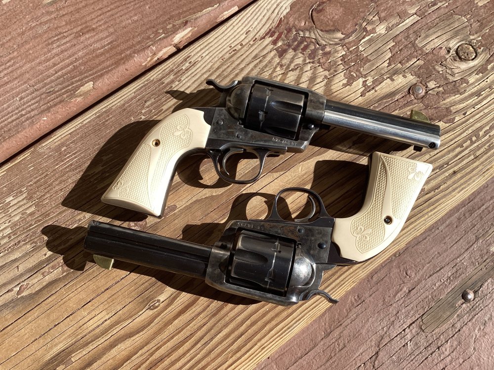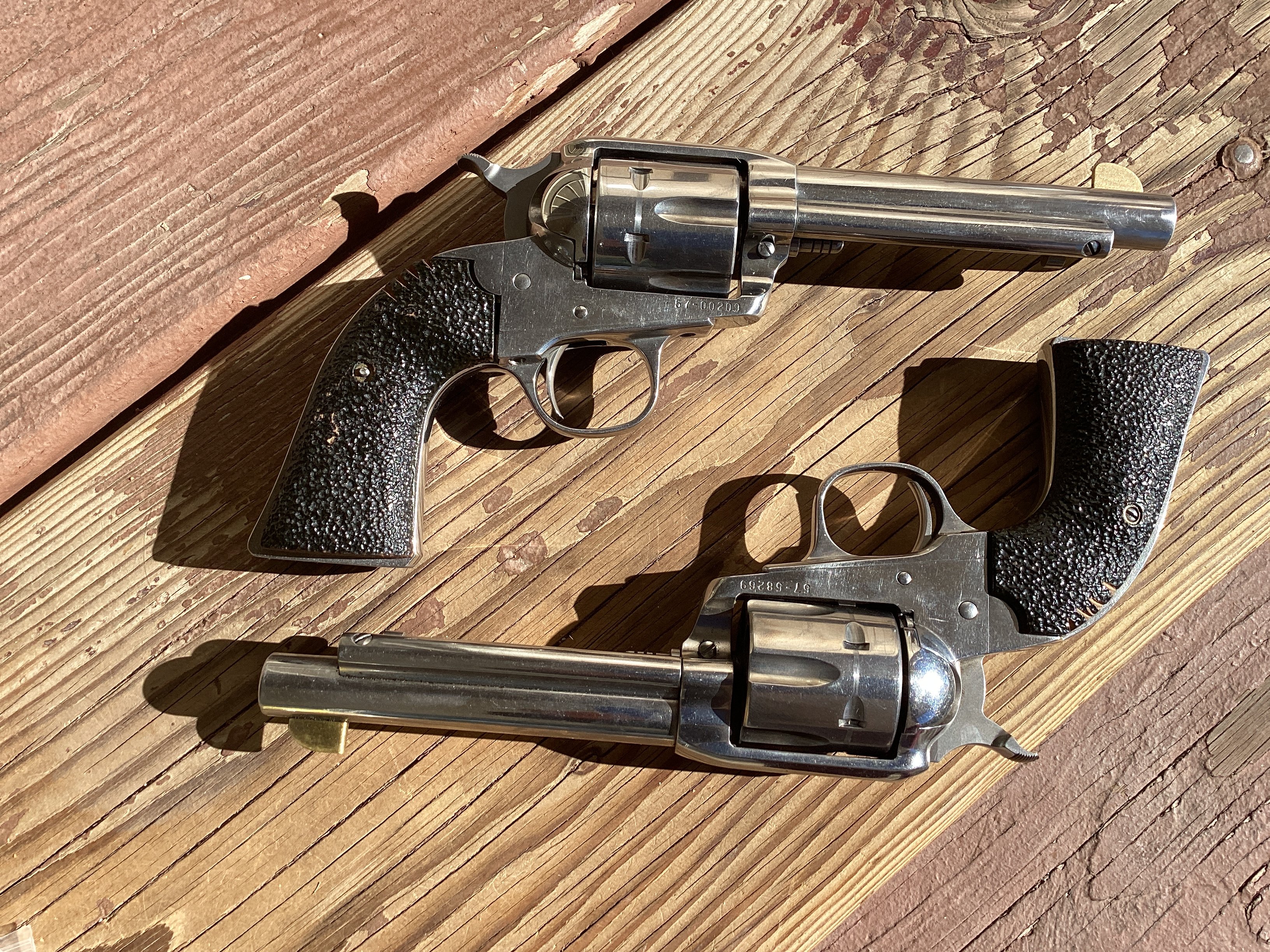 Pair Stainless Vaquero Bisleys in .45 Colt with 5-1/2” barrels, Shotgun Bogie installed short strokes, with extra grips and soft cases. Not Consecutive SN. $1900 OBO plus shipping