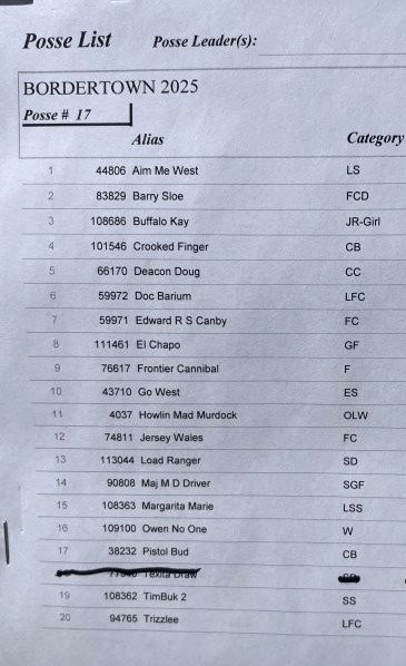 I look forward to shooting with posse 17. My wife and I often posse with Barry Sloe and Trizzlee. We have not seen Margarita Marie since Memorial Day weekend at the Geronimo Trails match. El Chapo is an avid Wild Bunch shooter who shot WB today and also at Land Run.