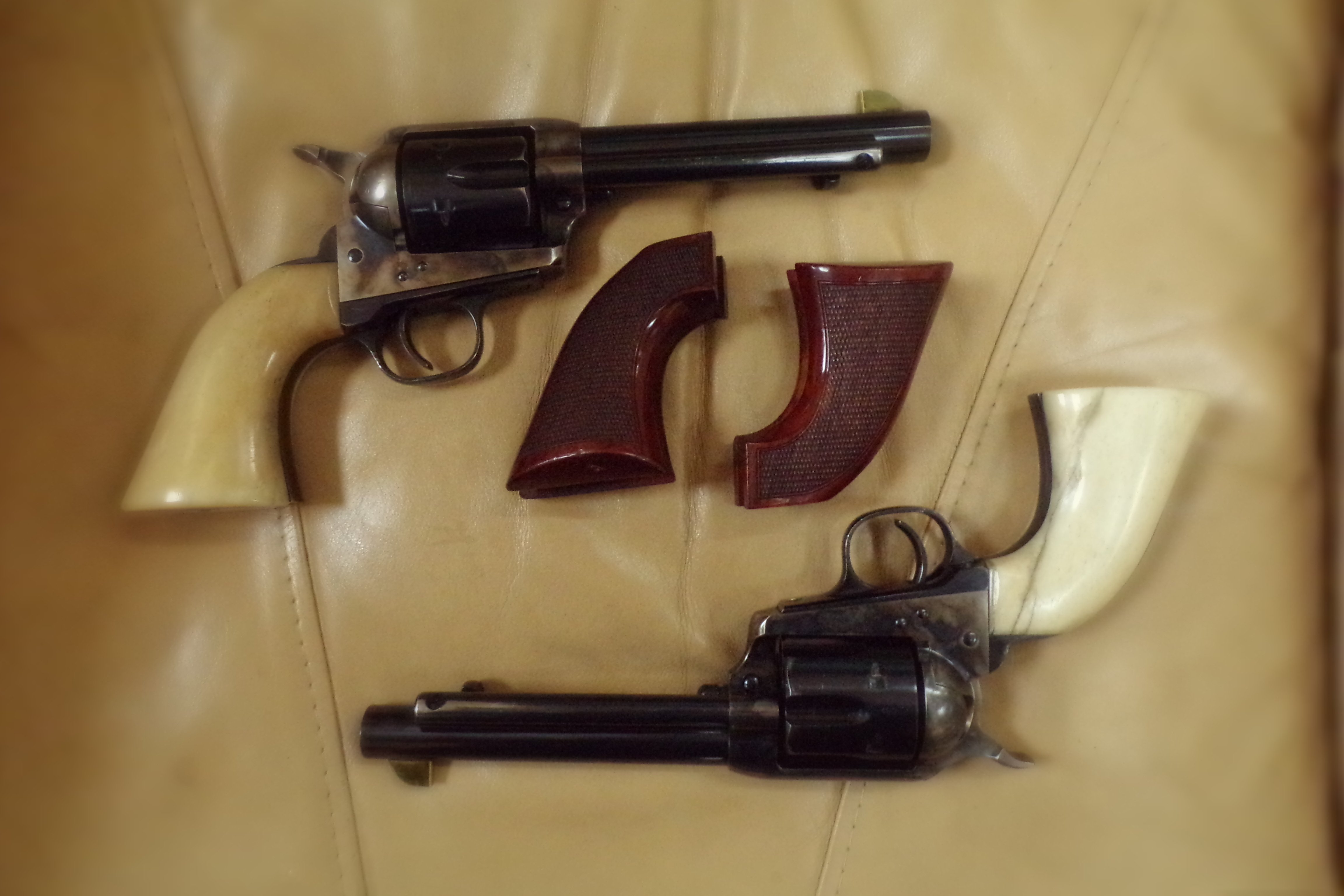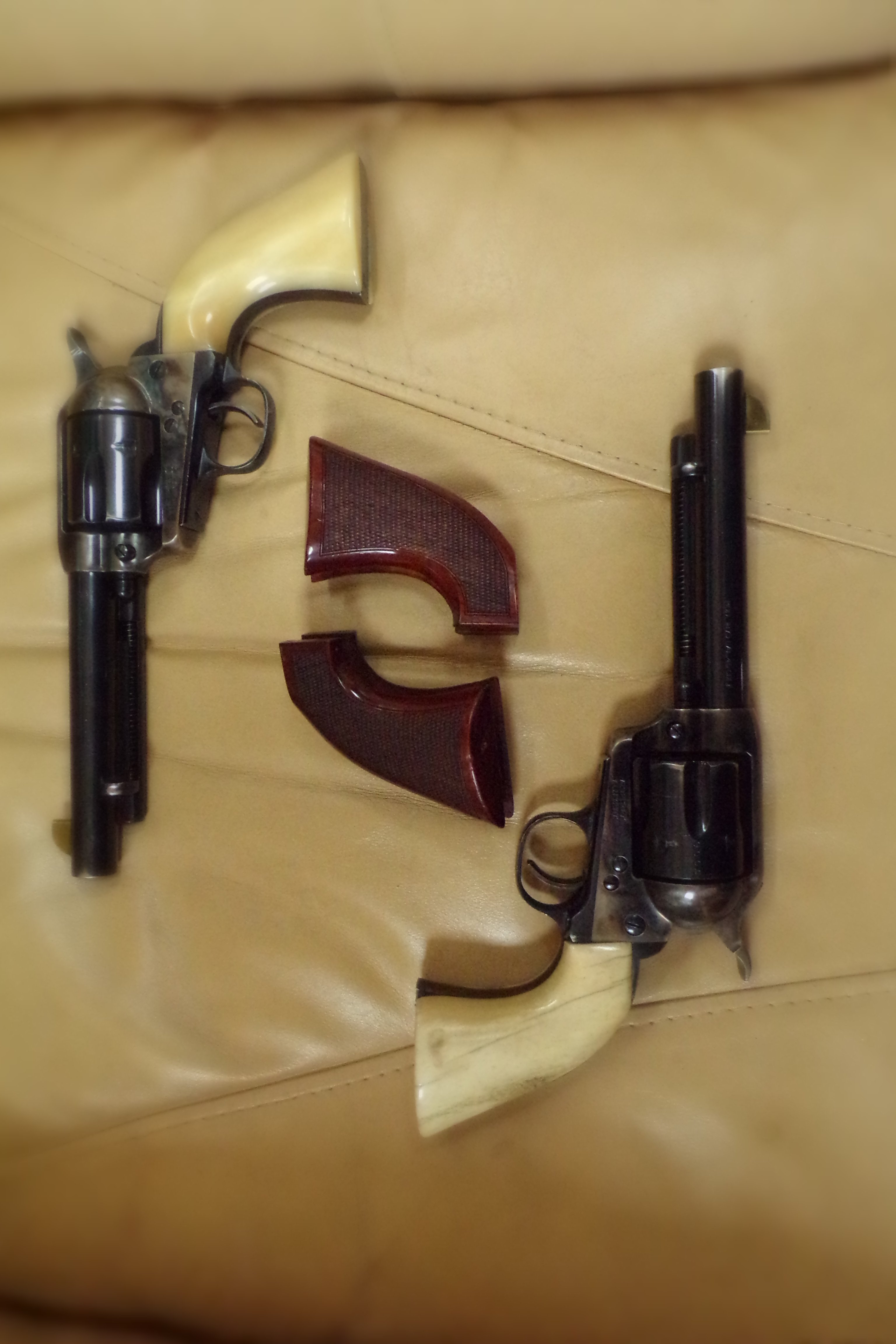 For sale is a pair of consecutive serial numbered Taylor's Runnin Irons. 5 1/2 inch barrel, .45 Colt, Sure Hit front sights and Giraffe bone grips. Includes the original gunfighter grips that came with the guns. The Giraffe bone grips are slightly bigger than the original gunfighter grips. Runnin Irons are short stroked with the shortened wider hammers. I used these guns as my primary guns for one season, then made the switch to Rugers. I will accept a Postal Money order or Certified Check. $1600 shipped from my FFL to your FFL.