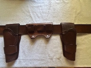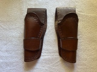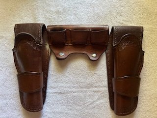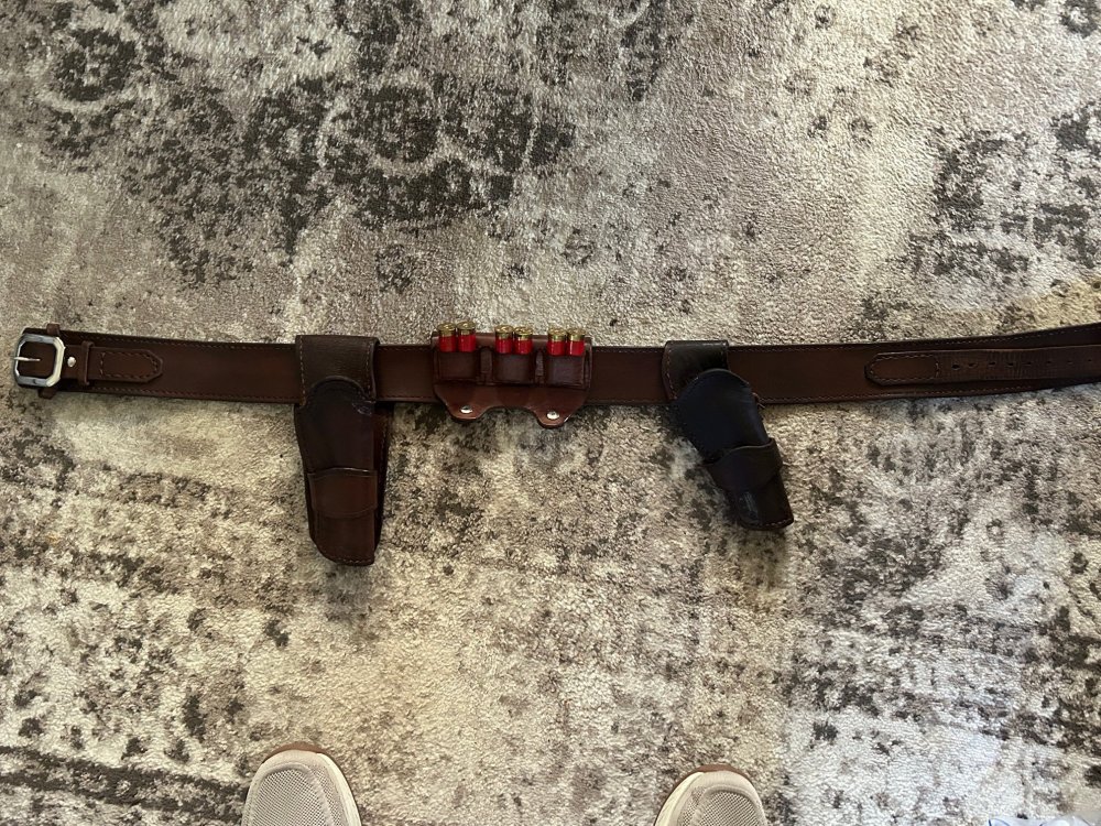 Selling some gun rigs Made by "Russ the Carver" Dark Russet Color Very Good condition High grain leather Quality Workmanship 2 Strong Side Holsters for 5 1/2" revolvers Right Hand Cross Draw included Gun Belt measures 48" to center hole. (Belt is lined) 6 Shell shotgun slide w/outward cant for easy access $200.00 shipped Thanks for lookin' and God Bless