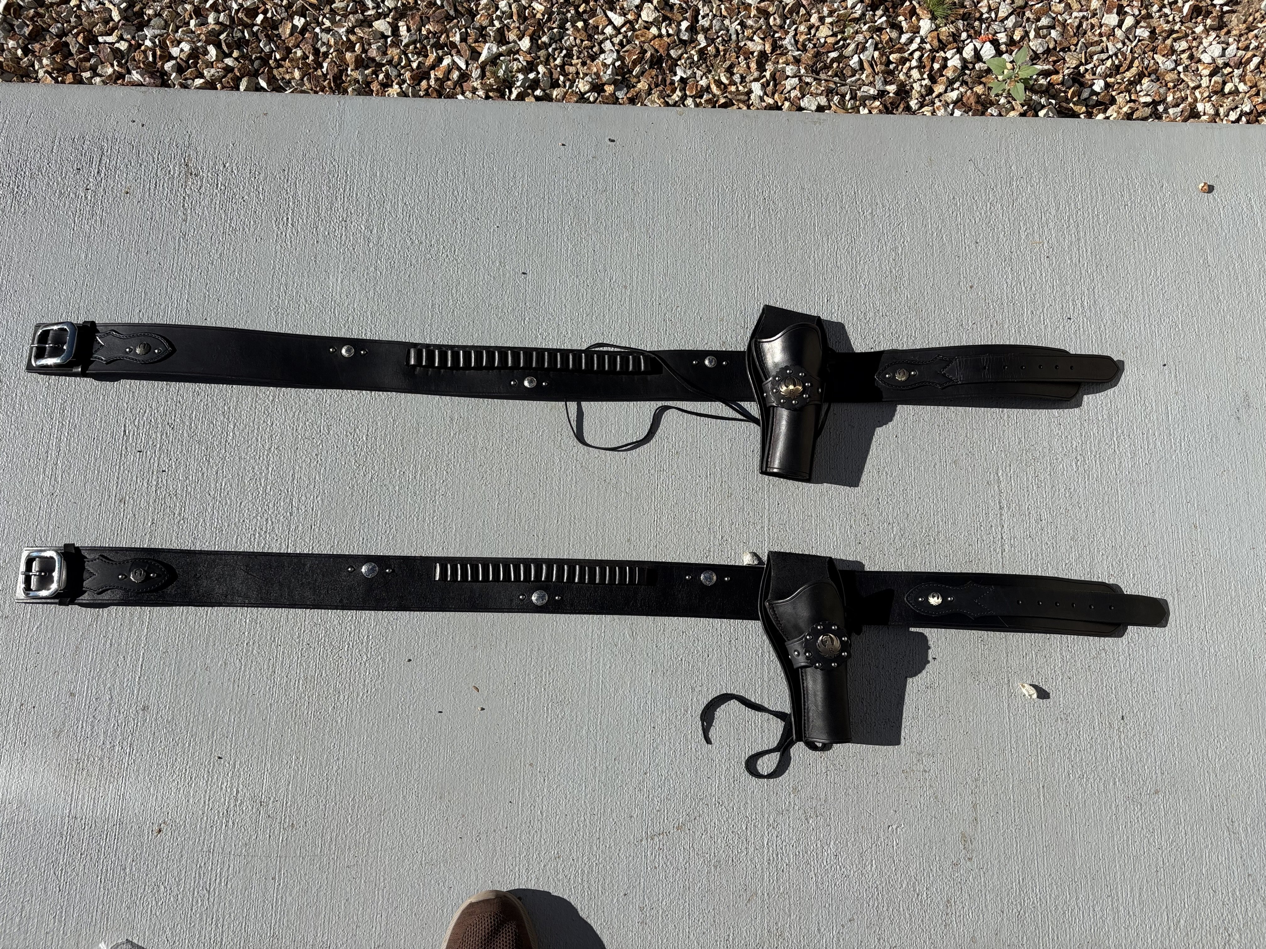 Near new, no wear, Kirkpatrick Leather, double holster rig for sale. $150 obo plus shipping or free pick up, Tellico Plains, Tennessee. Women's double holster rig for 5 1/2" .45lc SAA or Vaqueros. Black, tooled leather, silver medallions on holsters. Holds six 12 gauge shot shells center front. Used in three, maybe four events, shows no wear. Safe kept. Kirkpatrick sells these rigs for over $500. Email me: hd74squared@yahoo.com Or phone and leave message: 423-261-2240 Tennessee Dust #90148 Deal pending with Appalachian Alan. 1/31/2017 I didn't see a size stamp, it measures 42 to 48 inches, I am using a tape measure, as it was laid out on the bed. Replied to first e-mailer I got. Made in USA, 8 individual 12 gauge loops, silver medallion on each holster, black leather.