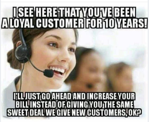 Alpo Posted August 29 Posted August 29 1 hour ago, Gracos Kid said: Many years ago when I first got on the internet, I got an email ad from BellSouth. My landline provider. And it said it was $14 a month for a phone. I looked at that for a little bit and then I called BellSouth. I asked them if that was the price and they said yes it was. I asked them why I was being charged $22. Well it seemed like 6 or 8 months ago they had had this rate decrease. And now it was 14. Again - so why am I paying 22? Simple. I had not asked for the cheaper rate. The price went down, but you had to ask for it. I asked for the cheaper rate and they hooked me up. I asked for a refund of the $8 a month I had been overpaying for the last 6 months. Weeeelllll, no that doesn't happen. 1 1 1 Quote