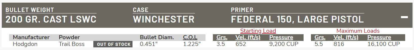 Chief Rick Posted December 25, 2021 Posted December 25, 2021 The Hodgdon Reloading Center website shows a max of 5.5 grains of Trail Boss with a 200 gr cast LSWC.