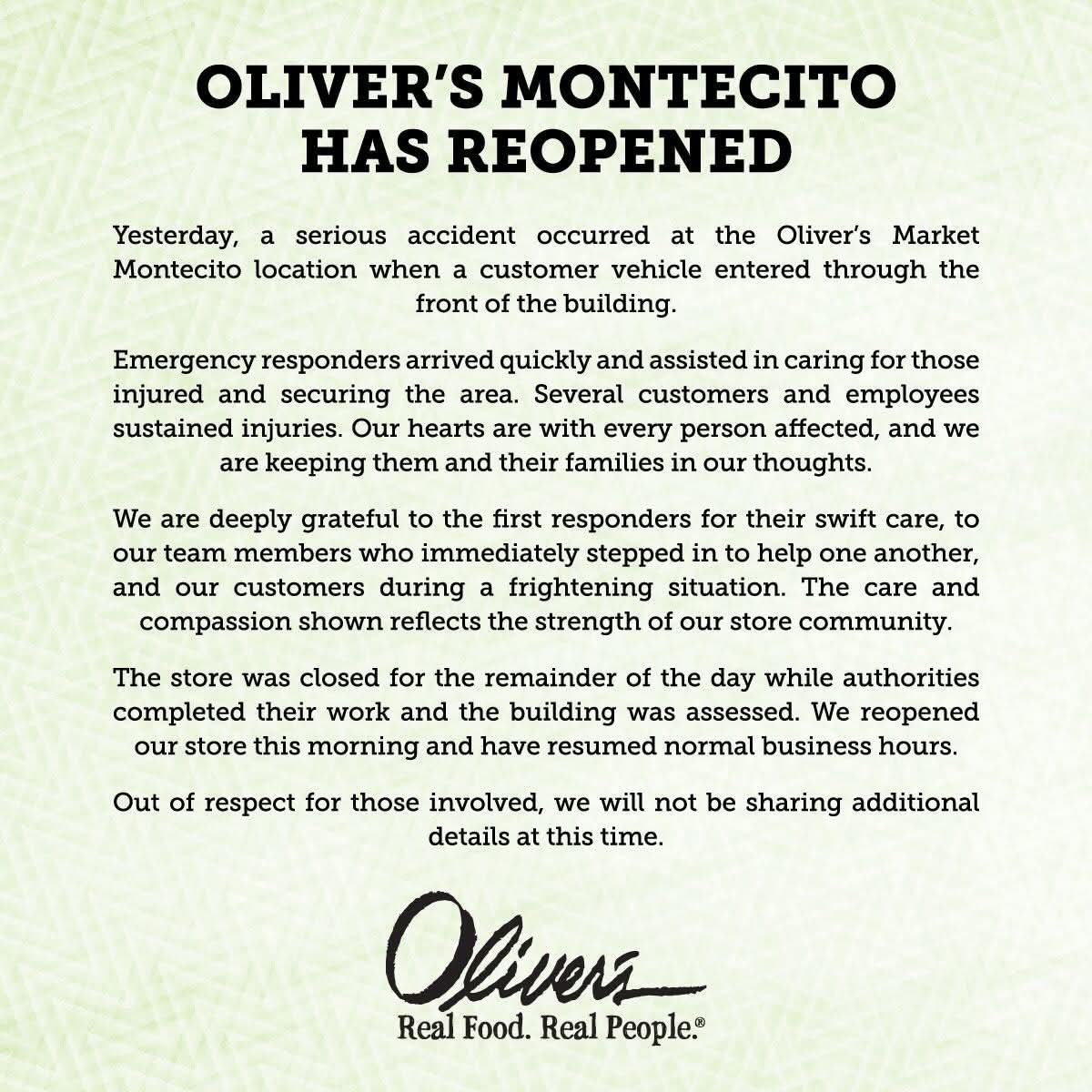 Subdeacon Joe Posted February 15 Author Posted February 15 On 2/13/2026 at 5:55 PM, Subdeacon Joe said: It's not a drive through. About half a mile away. 2/13/2026 - 1:30 PM PST SRPD Traffic Team Investigating Solo Vehicle Collision Into Oliver's Market at Montecito Center On February 13, 2026, at approximately 11:49 a.m., Santa Rosa Police Department (SRPD) officers and Santa Rosa Fire Department (SRFD) personnel were dispatched to Oliver’s Market, located 560 Montecito Center, for a report of a vehicle that had driven into the front of the store. Upon arrival, officers located a dark red Hyundai Tuscon that had collided with the front of the building and entered into the check stand area. Several individuals sustained minor to moderate injuries and were treated at the scene before being transported to a local hospital for further medical care. The driver, an adult female, remained at the scene and is cooperating with the investigation. The cause of the collision is still being investigated by the Santa Rosa Police Department Accident Investigations Team. The investigation remains ongoing. The store is expected to remain closed for at least the remainder of the day. The crash was Friday. On Saturday: 1 Quote