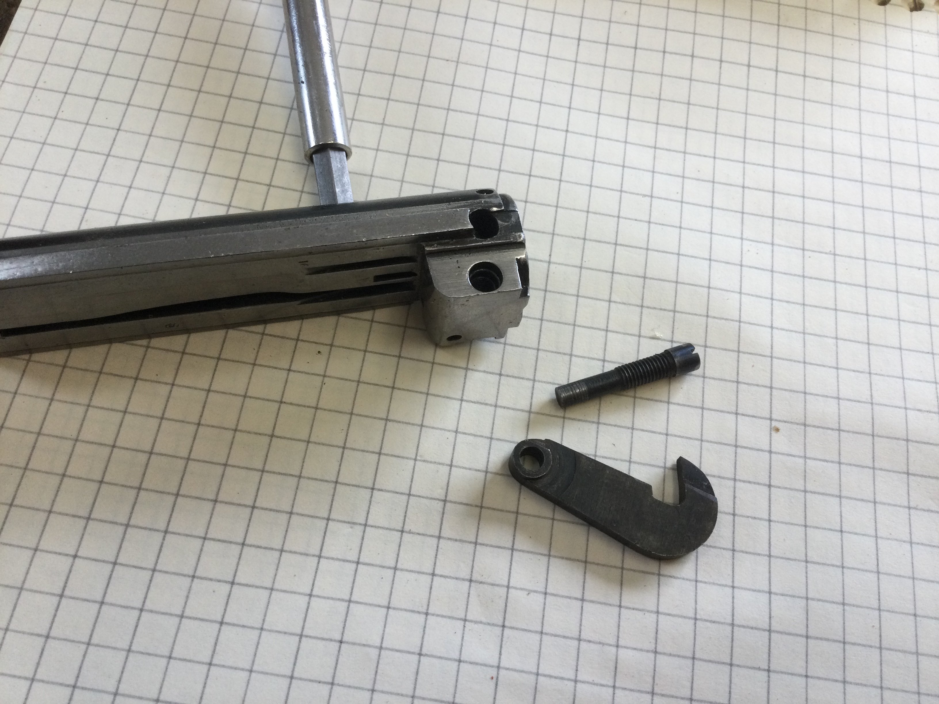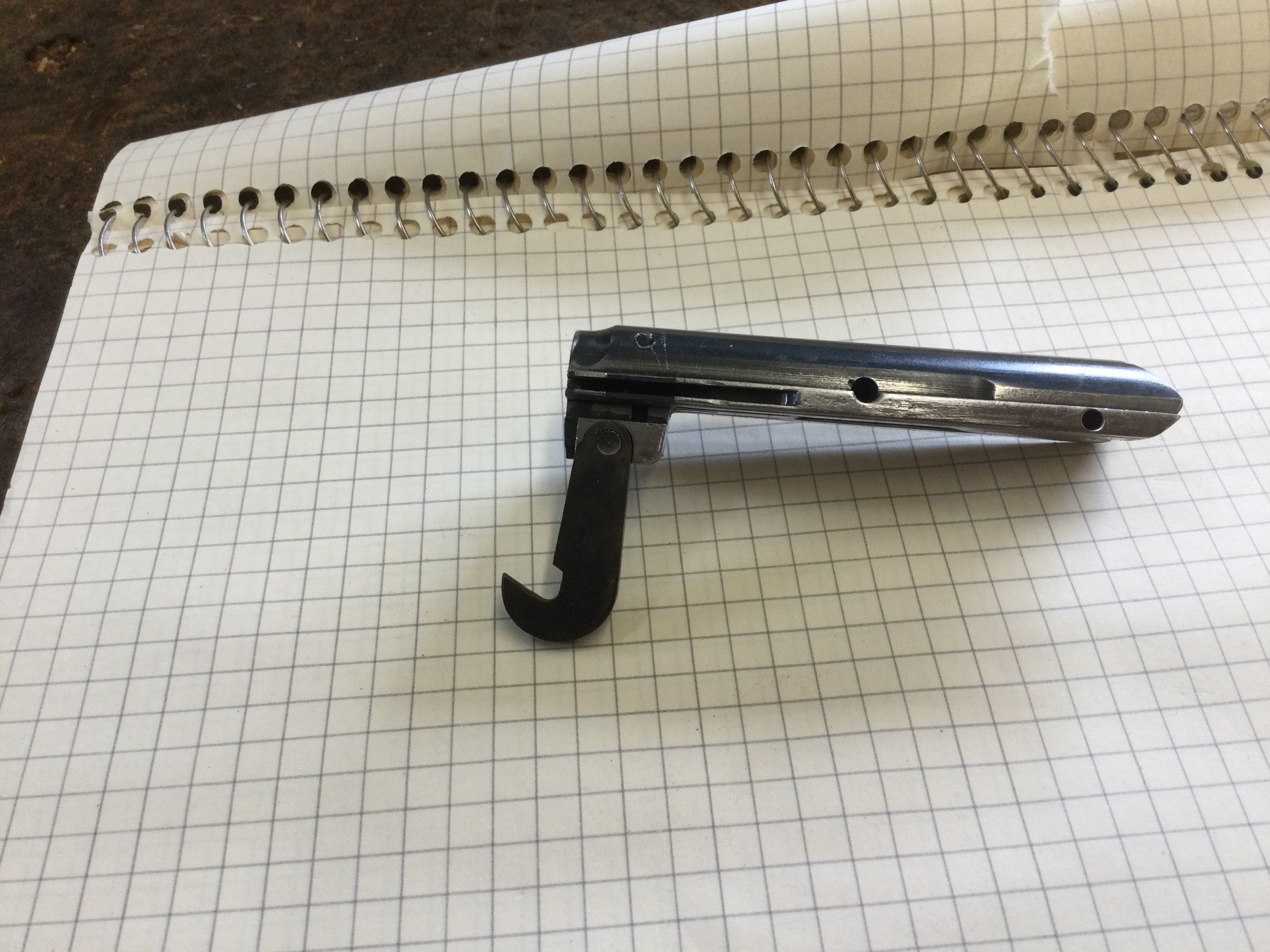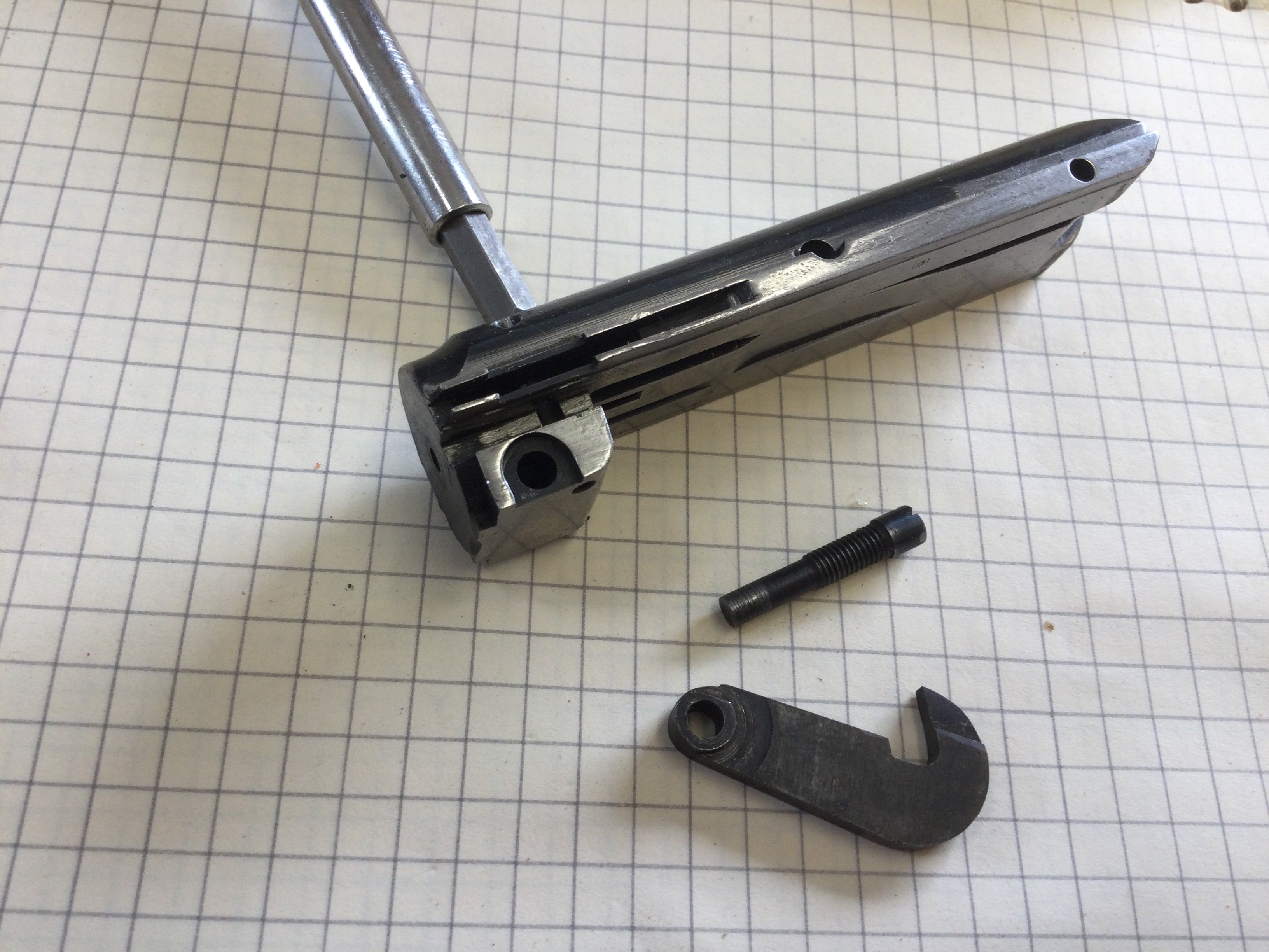 Yul Lose Posted August 22, 2023 Posted August 22, 2023 Work the slide enough to where you can back the screw out that holds the hook screw. Take the hook screw out and see if it is broken, it should have a smooth machined bottom surface. Compare it to the hook screw in my picture that I posted above. If it’s much shorter the hook screw is broken and the end is lodged in the hook. If it’s broken you’ll have to figure out how to get the tip out. I had one break that the tip came out rather easily and then the one on the 97 above that I posted. Both guns were hard to open as you describe.
