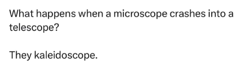 Marshal Mo Hare, SASS #45984 Posted August 26, 2024 Posted August 26, 2024 Elon Musk is planning a restaurant for a lunar colony. The food will be great but there’s just no atmosphere. 5 Quote