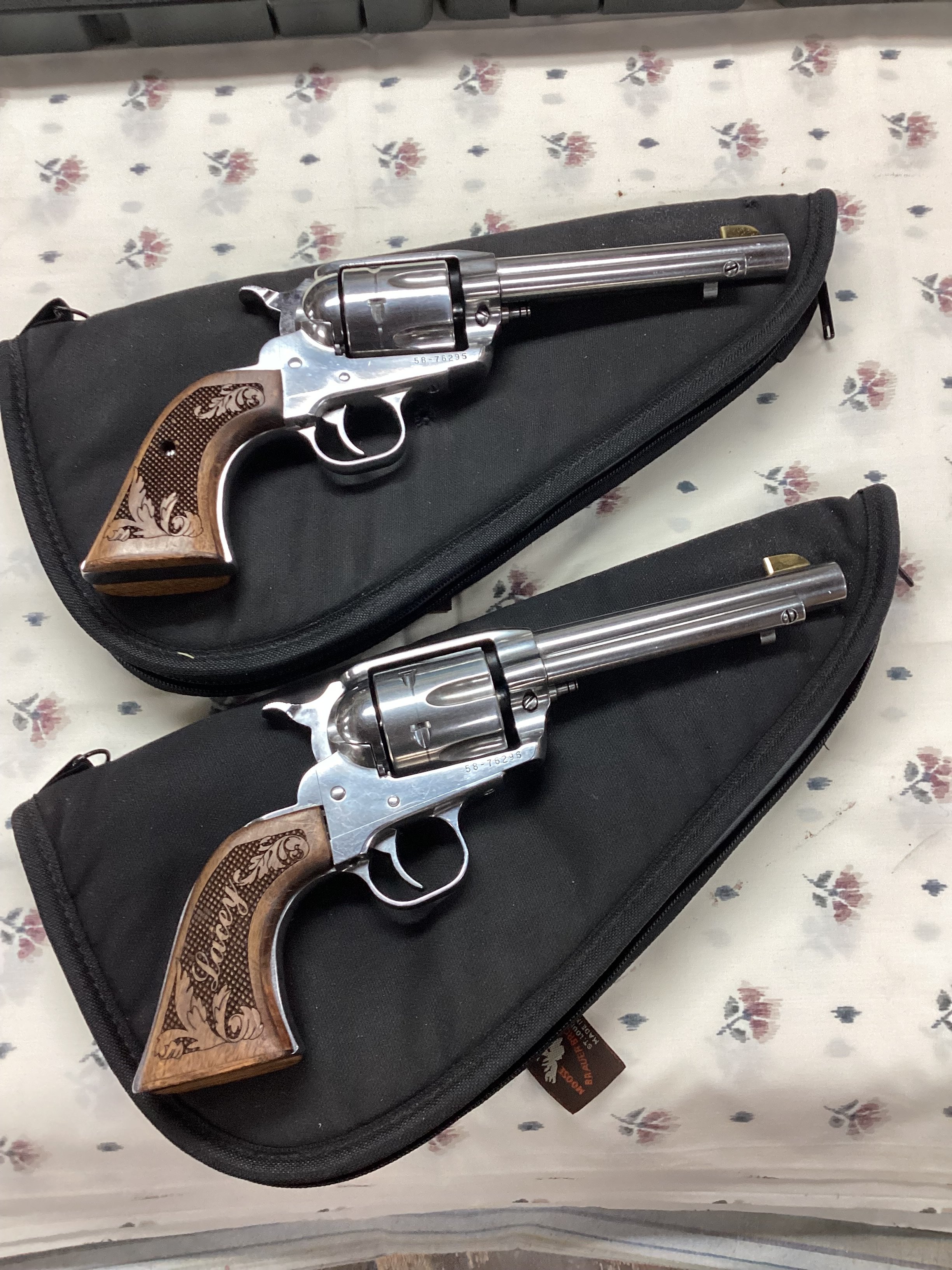 Rance - SASS # 54090 Posted September 13, 2025 Posted September 13, 2025 (edited) Special notice added.. Like it says I’m selling my wife’s (“Lacey Corsette”) pair of Original Ruger Vaqueros.. 357 caliber (always been shot with 38 special).. Stainless Steel .. 5 1/2” barrels that has Brass Sure Hit Sights on them.. (shoots point of aim).. Consecutive serial numbers.. Lowered super Blackhawk hammers (original hammers too) Lightened hammer springs ( never failed to fire using Federal or Winchester primers).. (Went from stock 23lb. to 17lb. I have other hammer springs I can throw in) Has never had a squib shot in them.. Stronger base pin spring installed.. Lightened trigger springs.. They have personalized custom laser cut grips with Lacey scripted into one side.. You can wear them with the Lacey showing on the outside of each or just laser cutting showing on the outside.. yer choice or… buy yerself a couple sets of grips.. or… name them both Lacey and say “I got a pair of Lacey’s.” Goin’ through my stuff again I found both sets of Ruger grips for these.. I included picture.. Both original Ruger boxes with locks included.. Reason for selling? We bought 2 pair of these back in maybe ‘03 or ‘04.. Mine was the blued model hers was the Stainless Steel model.. Everything that was done to one was done to the other.. We each had the others backup pistols.. Lacey quit shooting about 3 years ago.. We were talking yesterday about the idea of selling hers.. Talking today I commented My Vaqueros haven’t failed me once since I bought’em.. or yers.. I Don’t really need backups.. She said “SELL ‘EM!!” so here we are.. one owner set of pistols Big whoop huh!! Price: $1700.00 including Shipping plus FFL fees.. Payment: Personal or cashiers check or Postal Money Order.. I don’t do any of that there electronic stuff.. Personal Message me if interested.. PLEASE NOTICE: We are Snowbirds.. We will be leaving our Northern home the first part of November and heading South.. So we will not be able to ship purchased items.. They will be up North.. We can still do business.. but no shipping.. We return back up North first part of May.. and continue our business.. Thanks.. Hope ya understand.. Edited September 30, 2025 by Rance - SASS # 54090 5 Quote