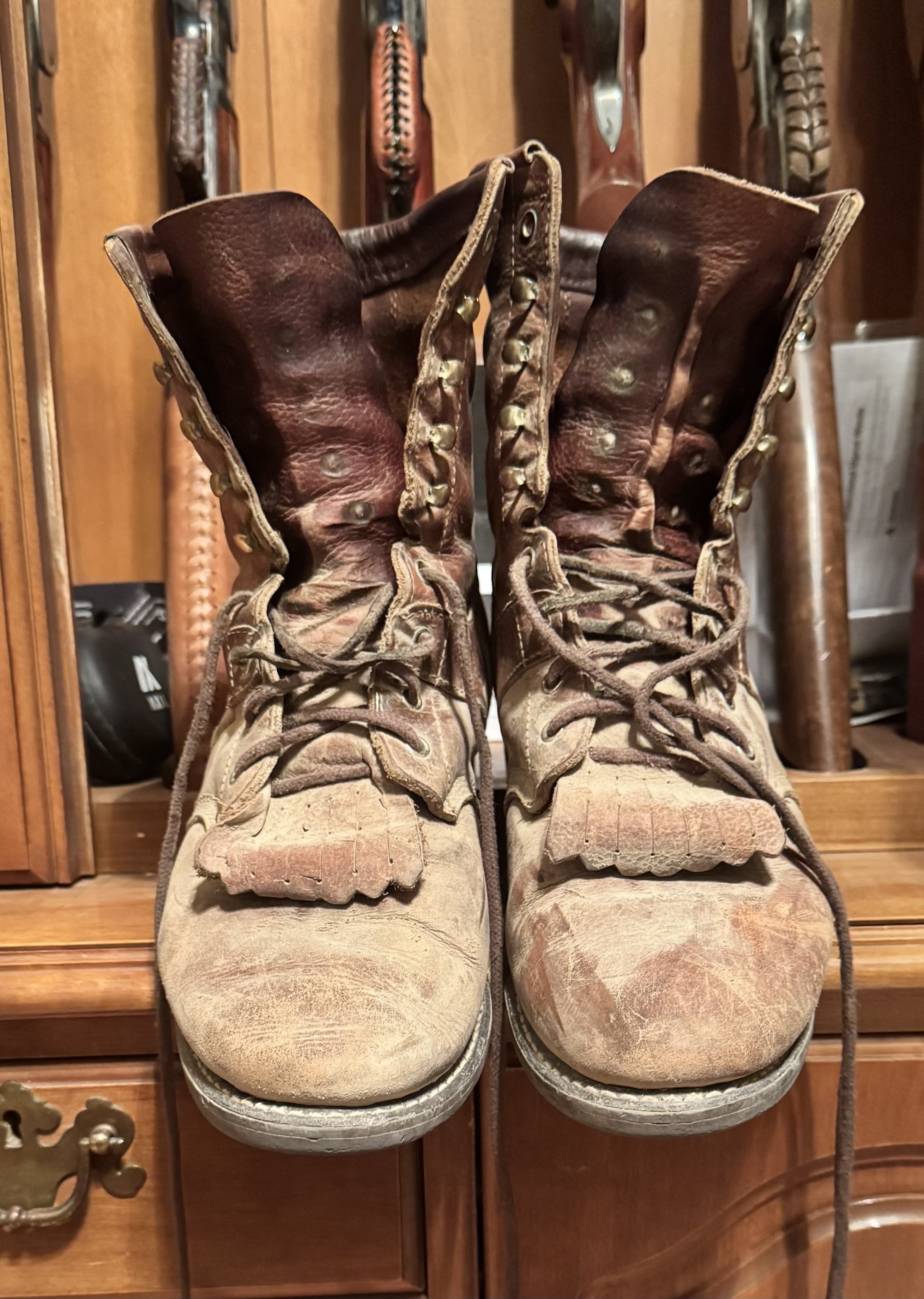Tall John Posted November 12, 2025 Posted November 12, 2025 I struggle with boots ‘cause I wear a size 15AA SHOE, have high arches back issues and a bionic hip.. I’ve had two pair of custom boots made and I sold (gave away) one pair ‘cause of immense discomfort and reserve the other for dress events ‘cause the cost as much as a slicked up Vaquero. I'm using these Redwing work boots and added a Tassel tongue protector. Curious to know if these would pass in the Classic Cowboy class ‘cause I can wear these all day. Quote