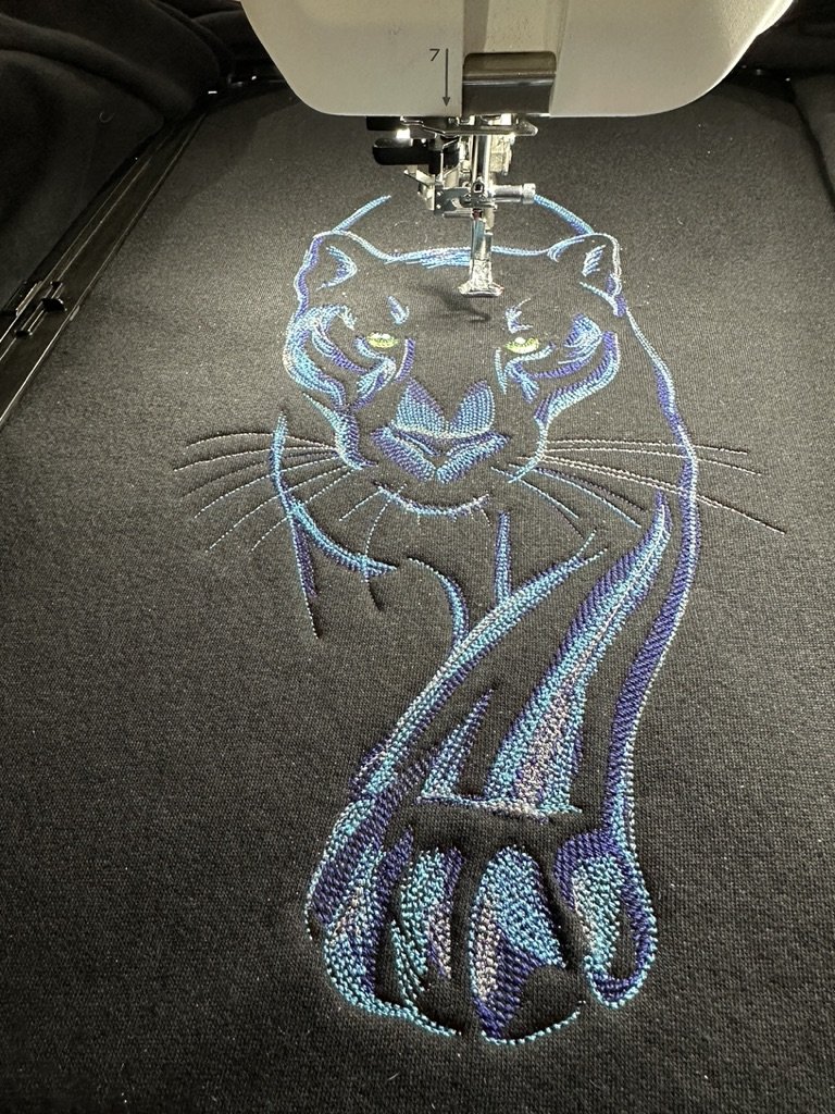 Eyesa Horg Posted December 12, 2025 Posted December 12, 2025 19 minutes ago, Calamity Kris said: It came with 5 hoops. The largest hoop is 11 x 17. That allows me to do things like this: My suggestion is contact a dealer and see if you can find a demo model or a good factory refurbished one. The prices have come down a little since I purchased mine, but not appreciably. I will certainly take her up on the offer of the SVG files. Please thank her for me. My favorite sites are Embroidery Library and Urban Threads. That's a pretty cool cat Kris. Awesome 1 Quote