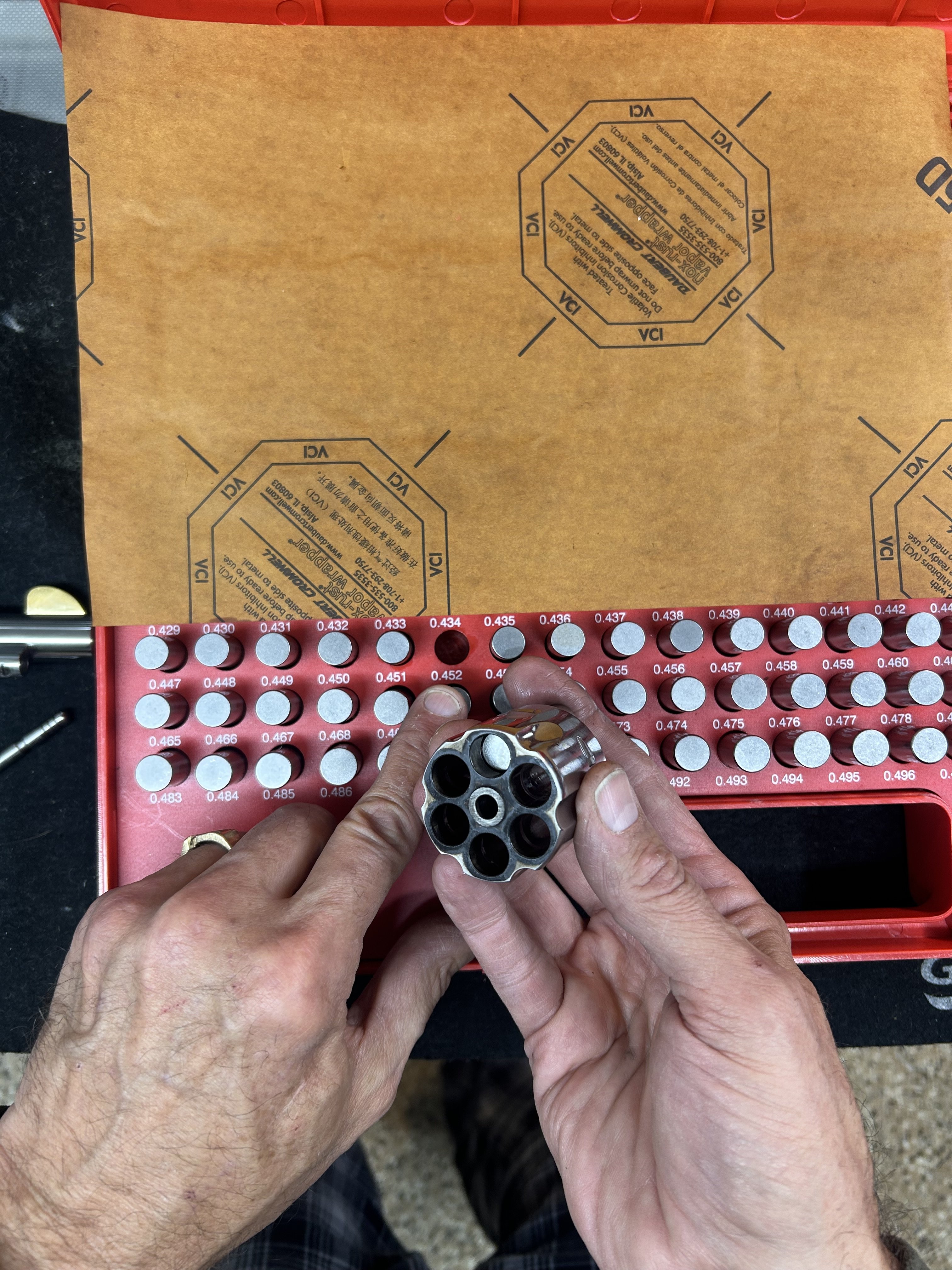 Tall John Posted December 31, 2025 Posted December 31, 2025 What should be the cylinder chamber exit diameter Ruger NMV 45 Colt pistol. I bought the gun used, but noticed when I took it to the range that I was having some difficulty both loading and extracting the cases after shooting from the cylinder. This is with OEM loaded ammunition from choice ammunition 200 grain RNFP bullet I also noticed the same thing with six of my dummy rounds that I’m preparing to reload. Both the Choice OEM ammunition, and my dummies drop in and out of a case gauge with no problem and they also cycle and plunk test in my 1873 with no problem so I don’t think I have a crimp issue. When loading, I’m having to push the round into the last 1/8” on about half of the chambers on my NMV. When I use a pin gauge on the cylinder chambers, a 0.450” pin slips right through, a 0.451” pin will slip through with some pressure, but a 0.452 “ pin stops solidly where the case ends in the cylinder. Is this normal? Do I just need to use a hone on the chambers to polish them or have them reamed? See the pictures below… Note that My unloading issues, seem to be the case rim scraping on the frame when trying to extract the empty case. I do not have have the ability to test the cylinder for its concentricity to see if is out of round. thoughts? .450” .451” 0.452” Quote