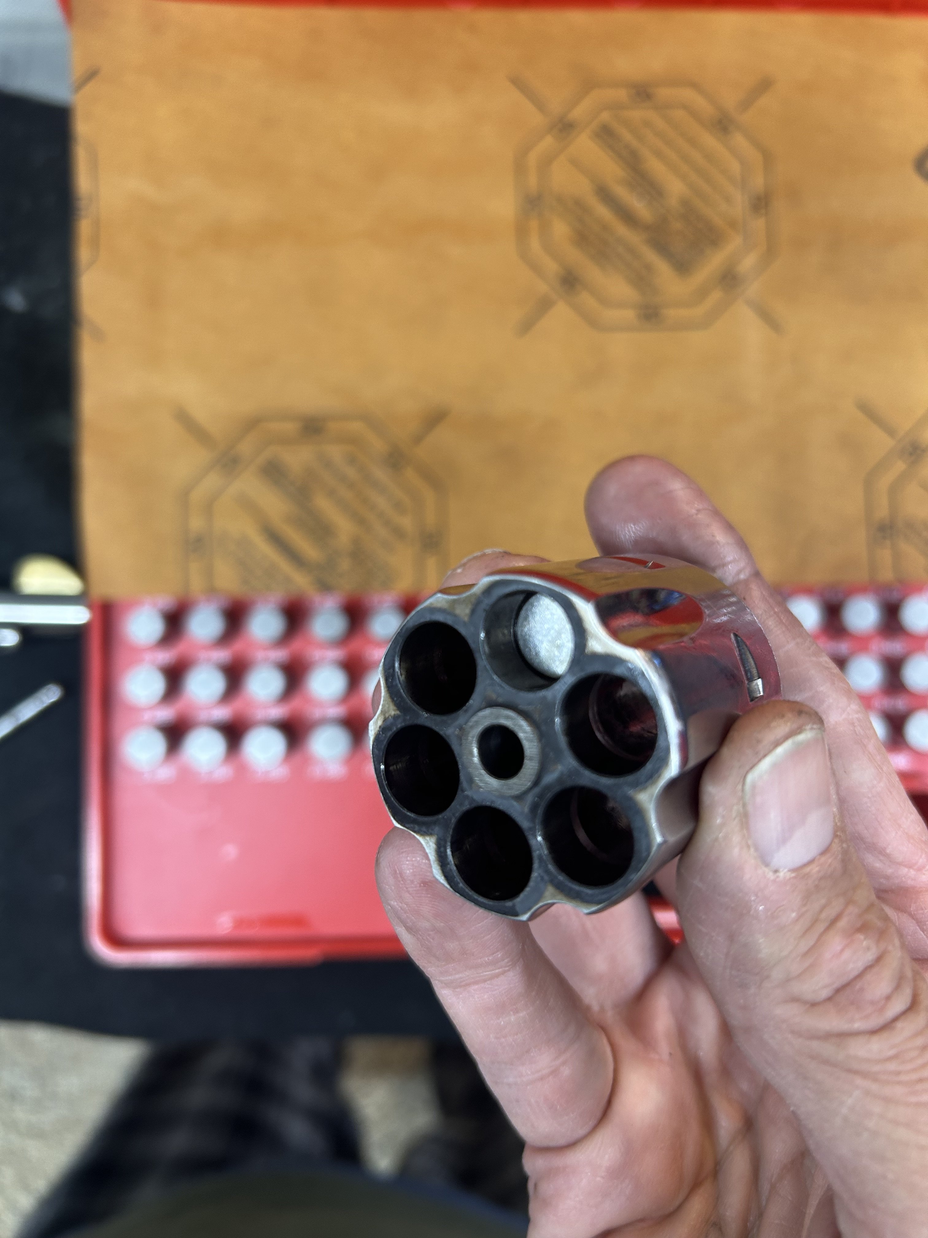 El Sobrante Kid Posted Saturday at 06:11 PM Posted Saturday at 06:11 PM 12 hours ago, Tall John said: it is interesting that the problem is now limited to ONE chamber. I bought this gun used, yes it has been a problem since acquisition, I currently only have 1 45 Colt NMV so I didn’t switch the cylinders. No chamber issues any longer since I honed them, just this clearance issue on one of the six chambers remains. It is not very likely, but it is a possibility, that the one chamber was cut off-center. A metal chip in the clamping fixture would cause that particular issue. Since you have a set of pin gauges, and hopefully a feeler gauge, insert the pin gauge into the chamber, and measure the minimum gap for each of the chambers between the pin and the frame. If the cylinder was cut off-center, the gap will be the tightest at your problem chamber, and the largest at the chamber on the opposite side. Quote
