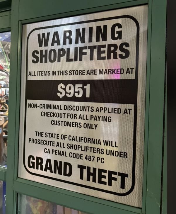 Alpo Posted January 1 Posted January 1 https://m.youtube.com/shorts/-Ggfvtzl81w Bummer. It won't embed. What it is is a sign that says that everything in the store is marked $951. If you are a paying customer and bring it up to the register you get a discount. Shoplifters, however - whatever they steal cost $951, and apparently the state of California has decided that is the value that something has to be before it becomes Grand theft. So you take a box of cracker jacks off the shelf, Marked $951, and take them up to the register and you get a $950 discount. But if you shoplift that box of cracker jacks, you stole a $951 item and that is Grand theft - a felony 4 Quote
