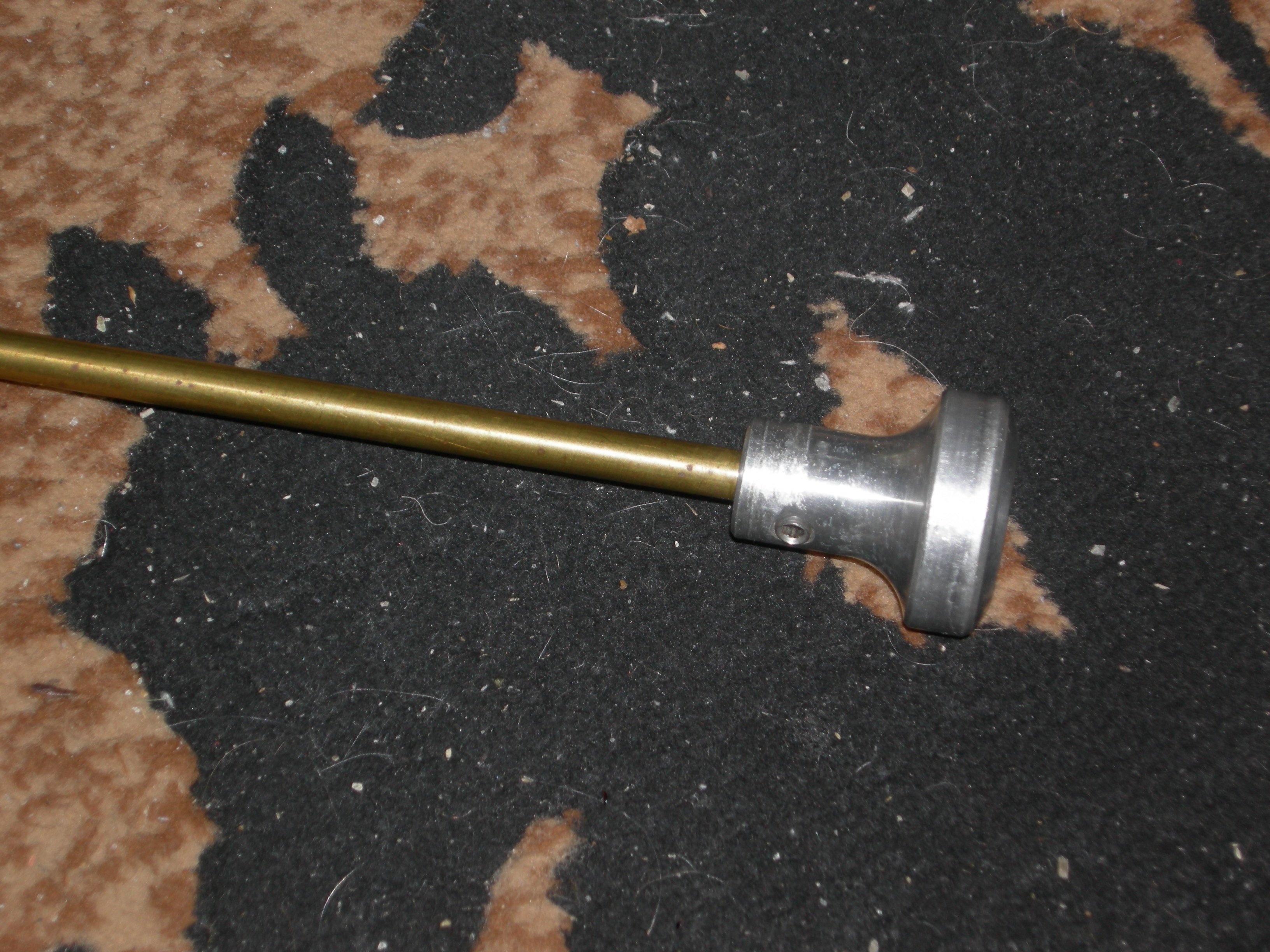 Griff Posted Friday at 03:46 PM Posted Friday at 03:46 PM My squib rod I received from T-Bone at CAC 2020... It's a solid rod .315" in diameter, 24-½" long and has an aluminum knob at the end. It's a slip fit in my .38s, Heavy enough that one drop is usually enough to dislodge a bullet in the barrel if close enough to the chamber. It rides around for free on my gun cart, used on several occasions, by myself and others, Easily worth far more than the few hours I spent setting up a Plainsman side match for T-Bone. Easily made from a 1-½" brass or other metal furniture knob and a 26" length of brass rod. Drill an appropriately sized hole in the knob, another thru the side, thread the one on the side and viola! Instant custom squib rod! 2 Quote