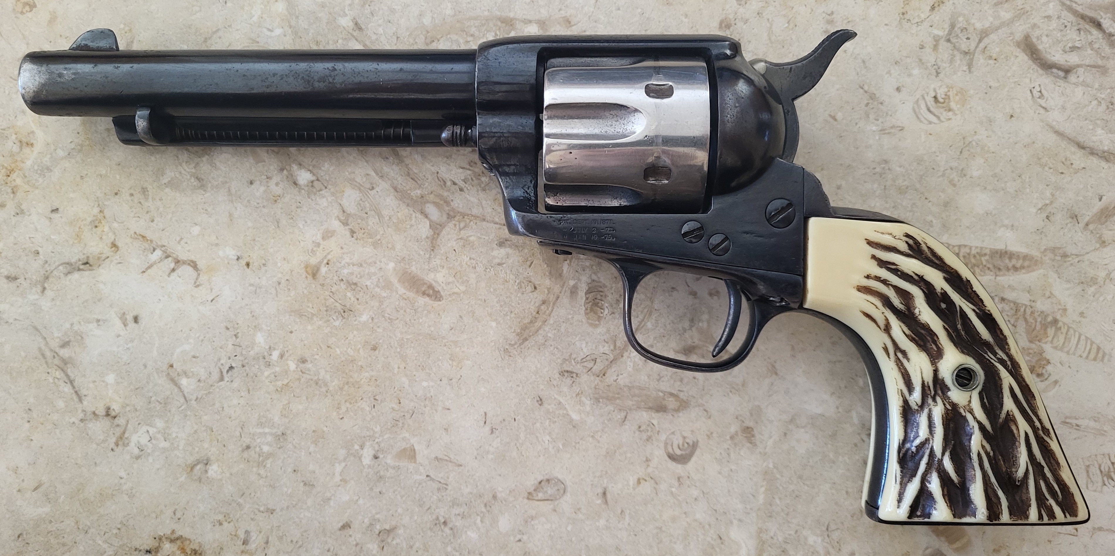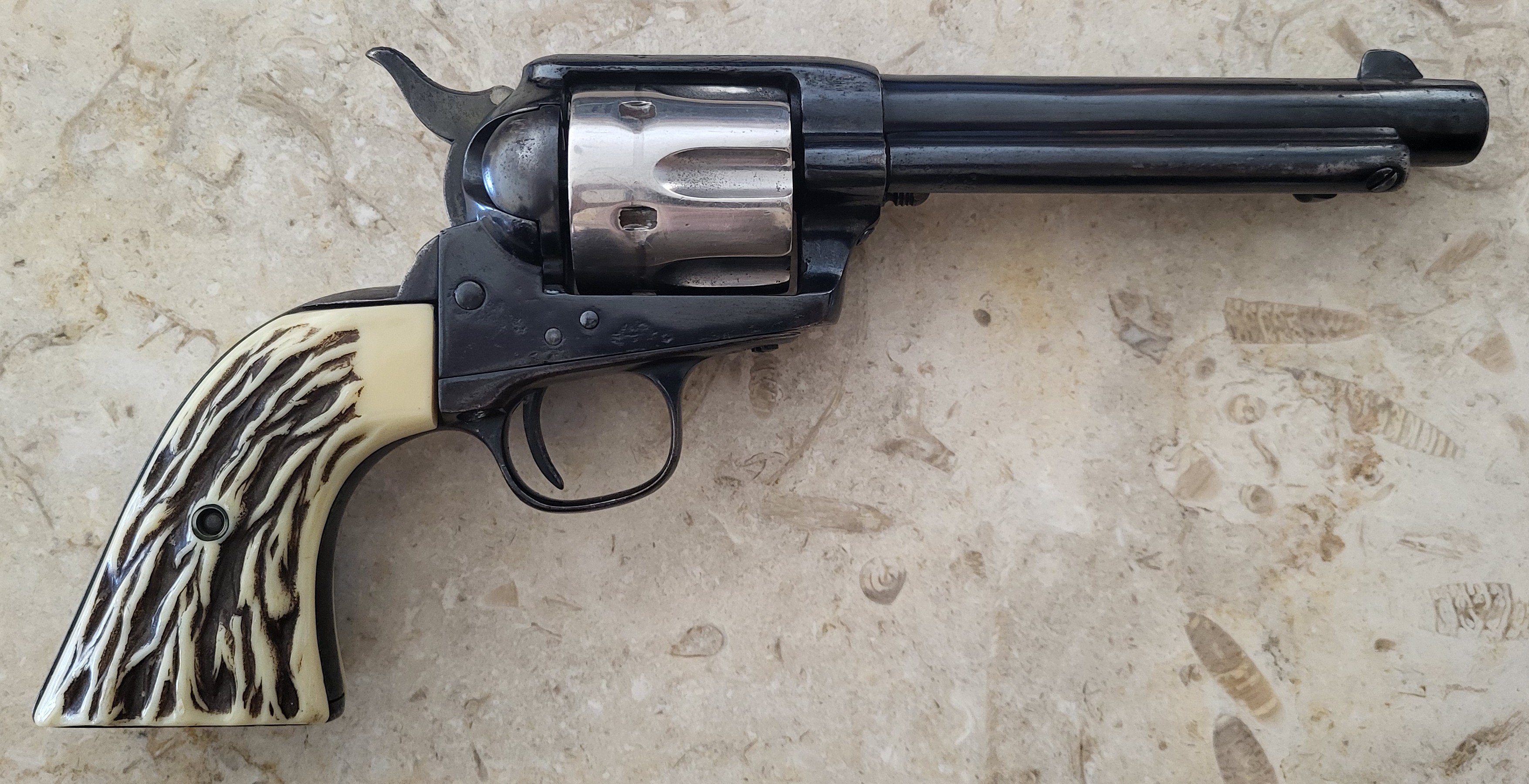 Nostrum Damus SASS #110702 Posted January 23 Posted January 23 This qualifies: You may have seen some of my other posts about it. It was made up sometime between about 60 and 150 years ago with parts from at least FIVE different Colt SAA revolvers. I have just recently (two days ago) finished working on it to make it shootable, the problem being that someone A LONG LONG TIME AGO IN A PLACE FAR FAR AWAY did a poor job of converting the cylinder from .38-40 to .44-40, so some work with an appropriate reamer was required. It is pretty cool. The parts date as follows: frame - 1878, trigger guard - 1882, backstrap - different but date unknown, barrel - date unknown, hammer - not an original Colt SAA hammer - origin is a total mystery, and grips - FRANZITE brand fake staghorn (FRANZITE grips were made from the 1930s to early 1960s). I've now loaded up a hundred or so .44-40 cartridges with APP under 200gn RNFP coated pills and will test fire it soon (after donning my UXO suit). 4 1 Quote