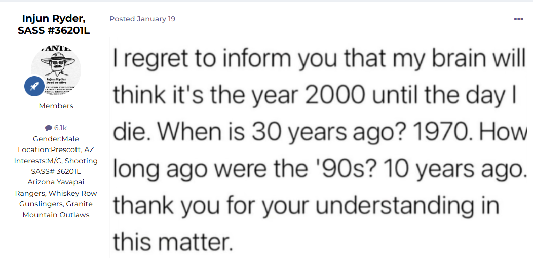 Sgt. C.J. Sabre, SASS #46770 Posted January 27 Posted January 27 Think about this: 1914 to 1970 is the same span as 1970 to today. I'm going to go lay down now. 2 2 1 Quote
