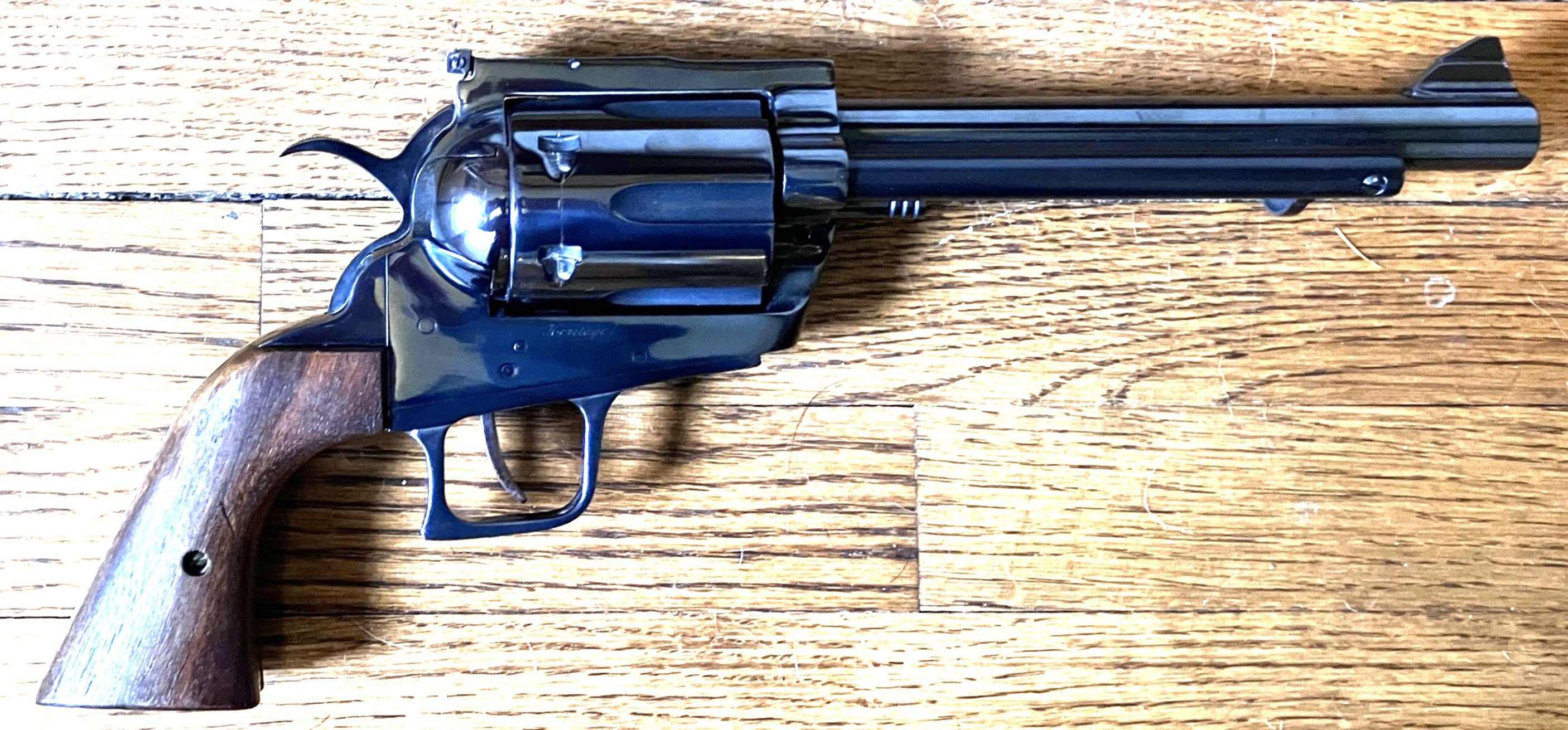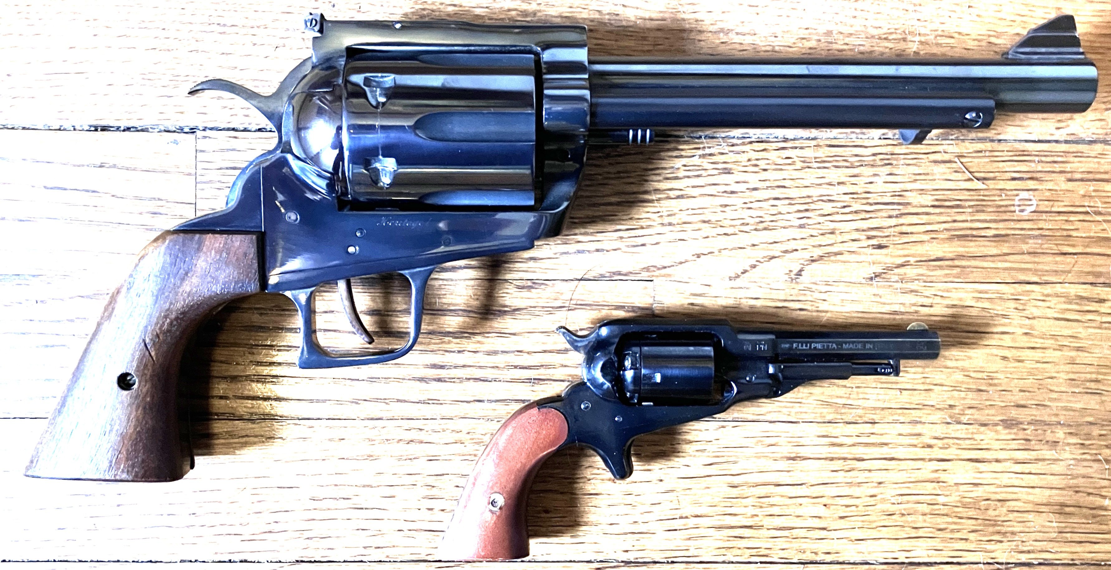 H. K. Uriah, SASS #74619 Posted April 7 Posted April 7 (edited) Remember these? That's my infamous Big Iron and my Small Iron revolvers in .45 and .32 respectively. Both are based on SAA clones. Fun to shoot, and while heavily customized, they are still fairly "ordinary" in their own way. There's nothing really "silly" about them. But, I think the next gun DOES qualify as "rather silly." This is a Phelps Manufacturing Heritage I revolver chambered for, wait for it... .45-70! I only discovered the existence of these things recently. It seems that Mr. Phelps left the Century Manufacturing Company soon after its founding and made these instead on his own. Clearly the same "design," as the Century Model 100, the only differences are the lack of a crossbolt safety, and it's blued steel instead of bronze. And, I got it for about half the price of what the Century pistols seem to be going for these days. Anyway, I wanted one of the Century guns ever since I saw them advertised in Guns & Ammo back in the early 70's, but could never find/afford one. So when I discovered these in general, and this one in specific, I scarfed it up! But, you know, there is a way that this can be even MORE silly. And that would be by pairing it with this... That's a Pietta replica of the model 1863 Pocket Revolver, converted to .32 S&W. I can't imagine a more dramatic difference. Yes, this is a very silly thing indeed. The Phelps weighs in at about 6 pounds, unloaded. I have a feeling that even though I am a strong advocate of 1 handed revolver shooting, I'll probably shoot this thing 2 handed. Not because I am worried about recoil. I have a feeling that my Trapdoor safe loads using Trailboss won't have much recoil to worry about, and that the weight of the gun will absorb it. But I don't know if I'll ever find out. I plant to shoot my .45-45 ammo in it. (.45-70 trimmed back to .45 Colt length.) So I'll be shooting ammo in it that is no more powerful than hefty .45 Colt loads. I just don't think recoil will be a problem. Of course it would be fun to shoot these gunfighter style. (Boom! pop. Boom! pop. Boom! pop. Boom! pop. Boom! pop.) But I don't think I could hold the big one up 1 handed long enough to try it. But, just for fun, it would be quite humorous to take the Phelps to the range and shoot at some paper targets. Four rounds of .45-45 smokeless and then 1 round of .45-70 loaded with black. I bet onlookers would be shocked! I think I shall dub these guns, The Giant Iron and the Mini Iron. No no no... This is getting far too silly. I see a British Colonel headed my way. I better get while the getting is good. Bye all! Edited April 7 by H. K. Uriah, SASS #74619 Quote